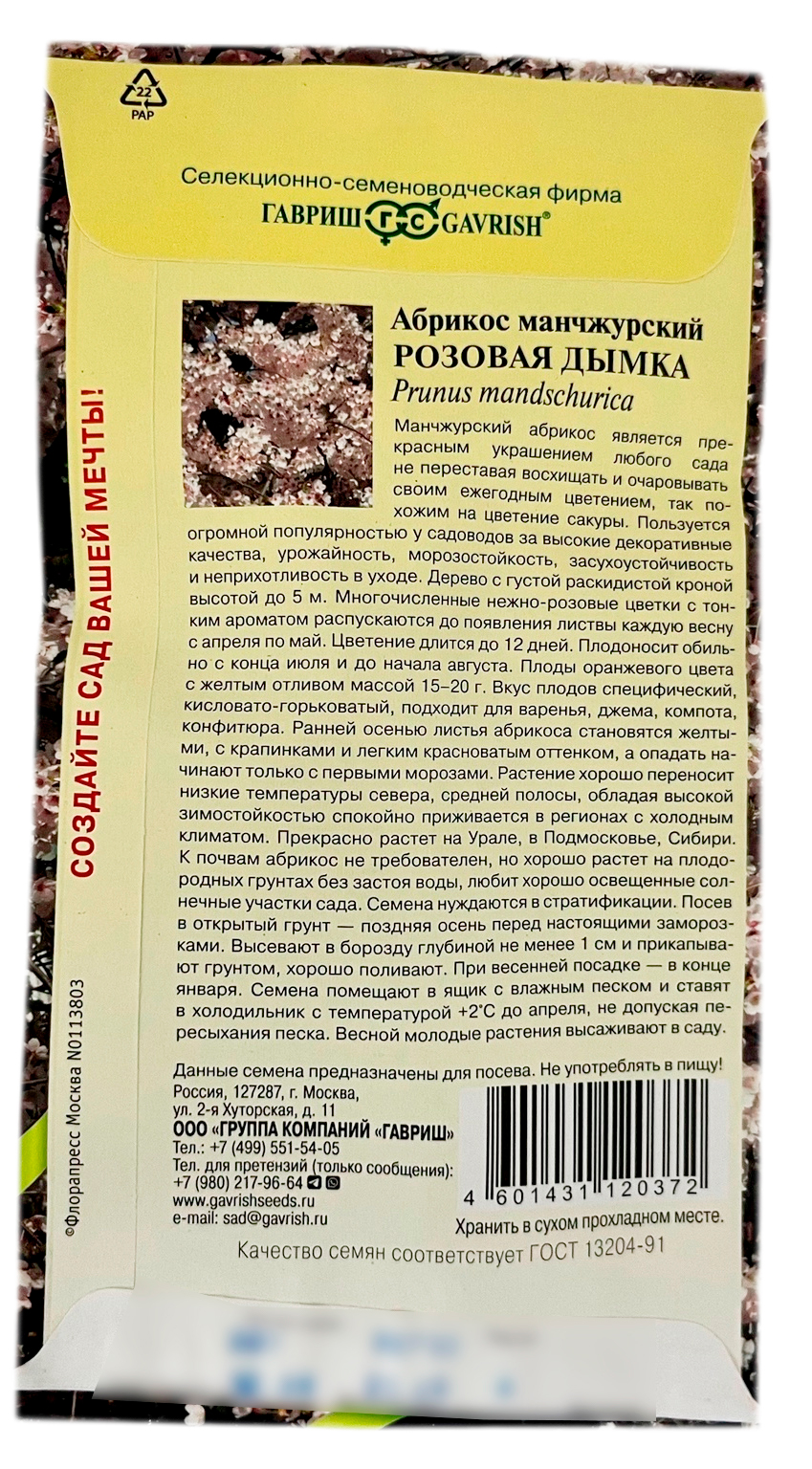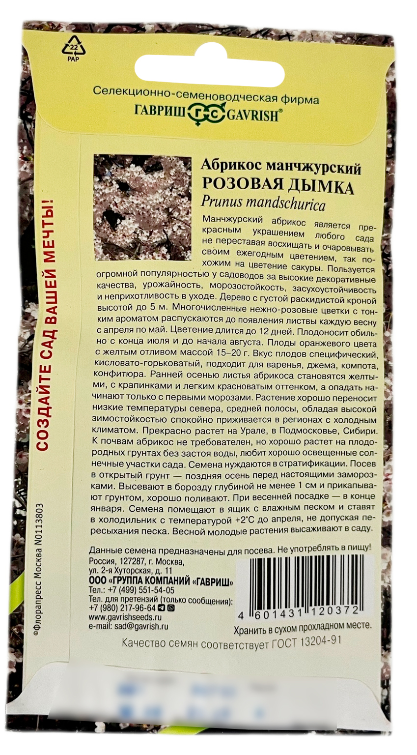 Абрикос манчжурский РОЗОВАЯ ДЫМКА ГАВРИШМаньчжурский абрикос является прекрасным украшением любого сада не переставая восхищать и очаровывать своим ежегодным цветением, так похожим на цветение сакуры. Пользуется огромной популярностью у садоводов за высокие декоративные качества, урожайность, морозостойкость, засухоустойчивость и неприхотливость в уходе. Дерево с густой раскидистой кроной высотой до 5 м. Многочисленные нежно-розовые цветки с тонким ароматом распускаются до появления листвы каждую весну с апреля по май. Цветение длится до 12 дней. Плодоносит обильно с конца июля и до начала августа. Плоды оранжевого цвета с желтым отливом массой 15-20 г. Вкус плодов специфический, кисловато-горьковатый, подходит для варенья, джема, компота, конфитюра. Ранней осенью листья абрикоса становятся желтыми, с крапинками и легким красноватым оттенком, а опадать начинают только с первыми морозами. Растение хорошо переносит низкие температуры севера, средней полосы, обладая высокой зимостойкостью спокойно приживается в регионах с холодным климатом. Прекрасно растет на Урале, в Подмосковье, Сибири. К почвам абрикос не требователен, но хорошо растет на плодородных грунтах без застоя воды, любит хорошо освещенные солнечные участки сада. Семена нуждаются в стратификации. Посев в открытый грунт — поздняя осень перед настоящими заморозками. Высевают в борозду глубиной не менее 1 см и прикапывают грунтом, хорошо поливают. При весенней посадке — в конце января. Семена помещают в ящик с влажным песком и ставят в холодильник с температурой +20С до апреля, не допуская пересыхания песка. Весной молодые растения высаживают в саду.