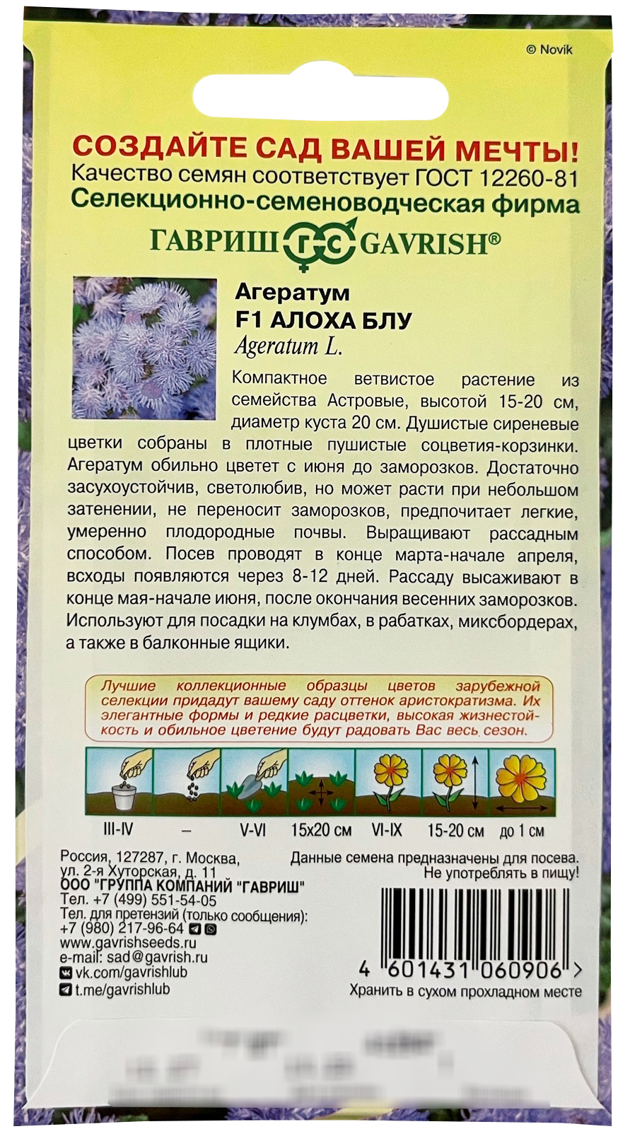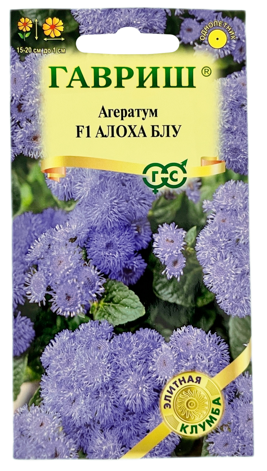 Агератум F1 Алоха Блу ГАВРИШКомпактное ветвистое растение из семейства Астровые, высотой 15-20 см, диаметр куста 20 см. Душистые сиреневые цветки собраны в плотные пушистые соцветия-корзинки. Агератум обильно цветет с июня до заморозков. Достаточно засухоустойчив, светолюбив, но может расти при небольшом затенении, не переносит заморозков, предпочитает легкие, умеренно плодородные почвы. Выращивают рассадным способом. Посев проводят в конце марта - начале апреля, всходы появляются через 8-12 дней. Рассаду высаживают в конце мая - начале июня, после окончания весенних заморозков. Используют для посадки на клумбах, в рабатках, миксбордерах, а также в балконные ящики.