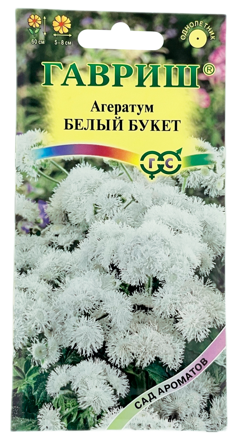 Агератум долгоцветка Белый букет ГАВРИШЭтот сорт агератума великолепен в срезке. Его душистые соцветия источают приятный парфюмерный аромат. Относится к семейству Астровые, культивируется как однолетник. Растение прямостоячее, ветвистое, высотой до 60 см. Цветение обильное с июня до заморозков. Душистые мелкие белые цветки собраны в плотные пушистые соцветия 5-8 см в диаметре. Достаточно засухоустойчивое, светолюбивое, но может расти при небольшом затенении, предпочитает легкие, умеренно плодородные почвы. Теплолюбив, заморозков не переносит. Выращивают рассадным способом. Посев проводят в конце марта-начале апреля, всходы появляются через 8-12 дней. Высадка рассады в конце мая-начале июня, после окончания весенних заморозков, по схеме 20 х 20 см. Используют для посадки на клумбах, в рабатках.