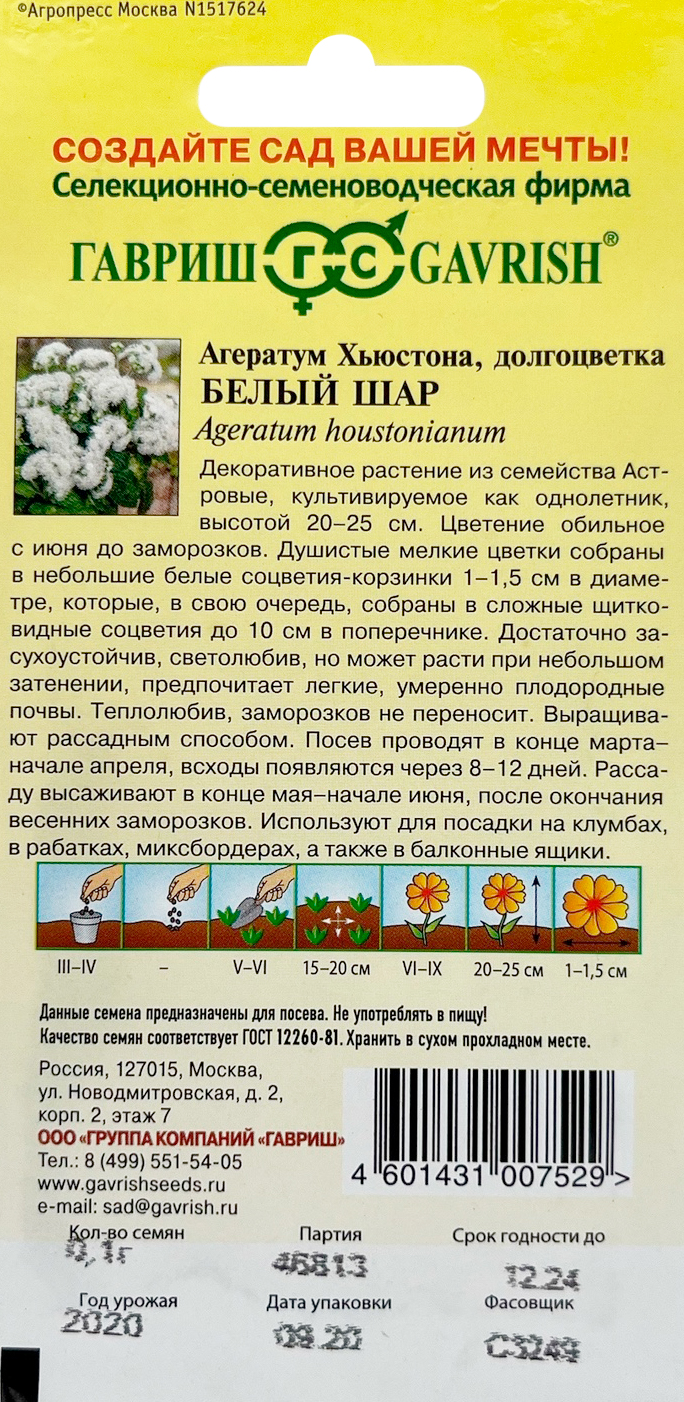 Агератум Белый шар* 0,1 г серия Сад ароматовДекоративное растение из семейства Астровые, культивируемое как однолетник, высотой 20-25 см. Цветение обильное с июня до заморозков. Цветки мелкие, узкотрубчатые, обоеполые, душистые, собраны в небольшие соцветия-корзинки 1-1,5 см в диаметре, которые, в свою очередь, собраны в сложные щитковидные соцветия до 10 см в поперечнике. Достаточно засухоустойчив, светолюбив, но может расти при небольшом затенении, предпочитает легкие, умеренно плодородные почвы. Теплолюбив, заморозков не переносит. Выращивают рассадным способом. Посев проводят в конце марта-начале апреля, всходы появляются через 8-12 дней. Рассаду высаживают в конце мая-начале июня, после окончания весенних заморозков. Используют для посадки на клумбах, в рабатках, миксбордерах, а также в балконные ящики.
