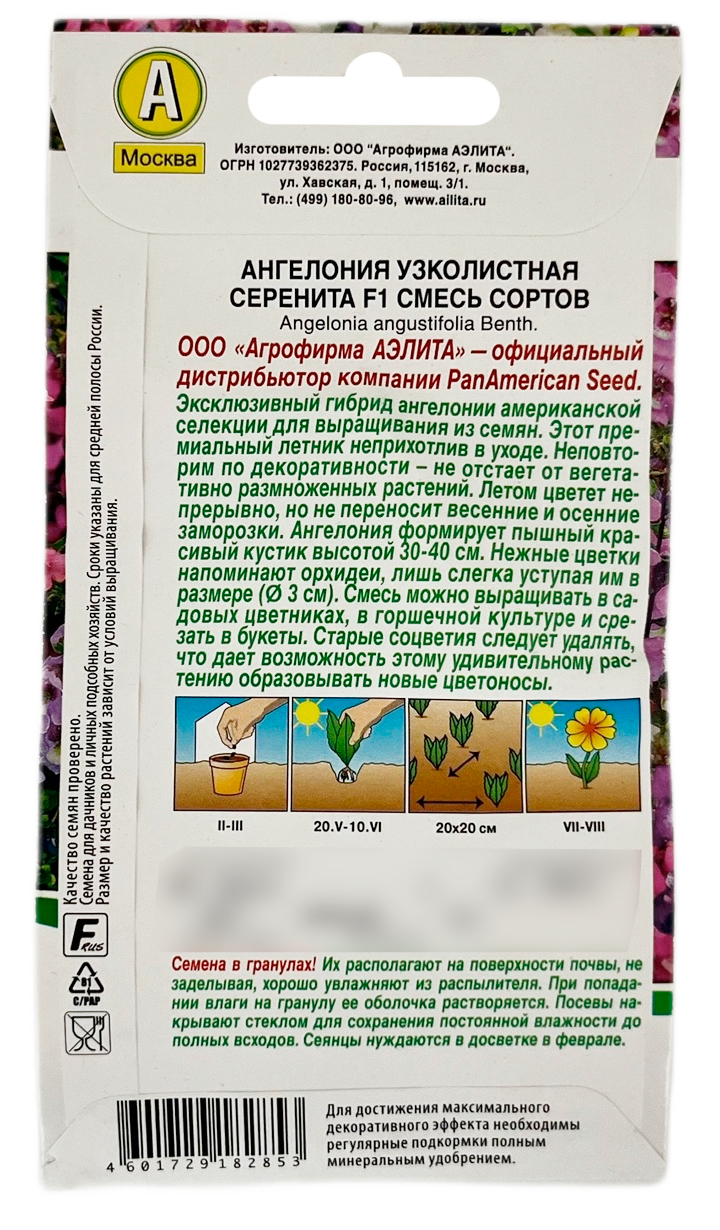 Ангелония узколистная СЕРЕНИТА смесь сортов АЭЛИТАЭксклюзивный гибрид ангелонии американской селекции для выращивания из семян. Этот премиальный летник неприхотлив в уходе. Неповторим по декоративности – не отстает от вегетативно размноженных растений. Летом цветет не прерывно, но не переносит весенние и осенние заморозки. Ангелония формирует пышный красивый кустик высотой 30-40 см. Нежные цветки напоминают орхидеи, лишь слегка уступая им в размере (Ø 3 см). Смесь можно выращивать в садовых цветниках, в горшечной культуре и срезать в букеты. Старые соцветия следует удалять, что дает возможность этому удивительному растению образовывать новые цветоносы.