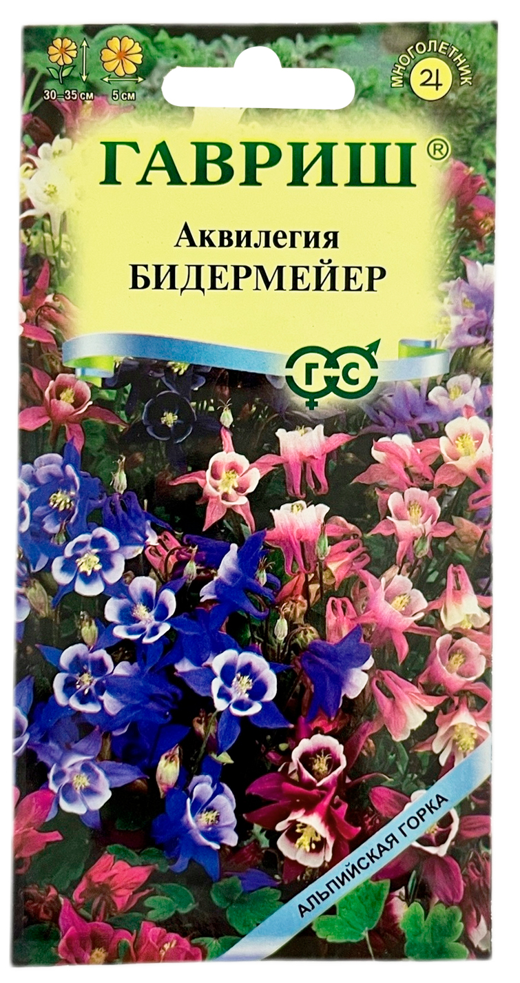 Аквилегия культурная водосбор БИДЕРМЕЙЕР ГАВРИШНеприхотливое растение семейства Лютиковые высотой до 35 см. Ценится за оригинальные поникающие цветки разнообразной окраски и ажурные листья. Цветет с конца мая до середины июля. Желательно высаживать в полутени, но может расти и на солнечных участках. К почве нетребовательна, но предпочитает легкие, хорошо удобренные, дренированные участки. Размножают посевом в открытый грунт в мае или под зиму. При весеннем посеве семена необходимо стратифицировать промораживанием. Используется для оформления участка, прекрасно подходит для альпинария.