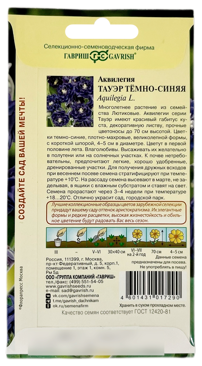 Аквилегия ТАУЭР ТЁМНО СИНЯЯ ГАВРИШМноголетнее растение из семейства Лютиковые. Аквилегии серии Тауер имеют красивый габитус куста, декоративную листву, прочные цветоносы до 70 см высотой. Цветки темно-синие, плотно-махровые, великолепной формы, с короткой шпорой, 4-5 см в диаметре. Цветут с конца мая до середины июля. Влаголюбивы. Высаживать их желательно в полутени или на солнечных участках. К почве нетребовательны, предпочитают легкие, хорошо удобренные, дренированные участки. Размножают посевом семян в открытый грунт в мае или под зиму. При весеннем посеве семена необходимо стратифицировать промораживанием. Отлично украсит сад, городской парк.