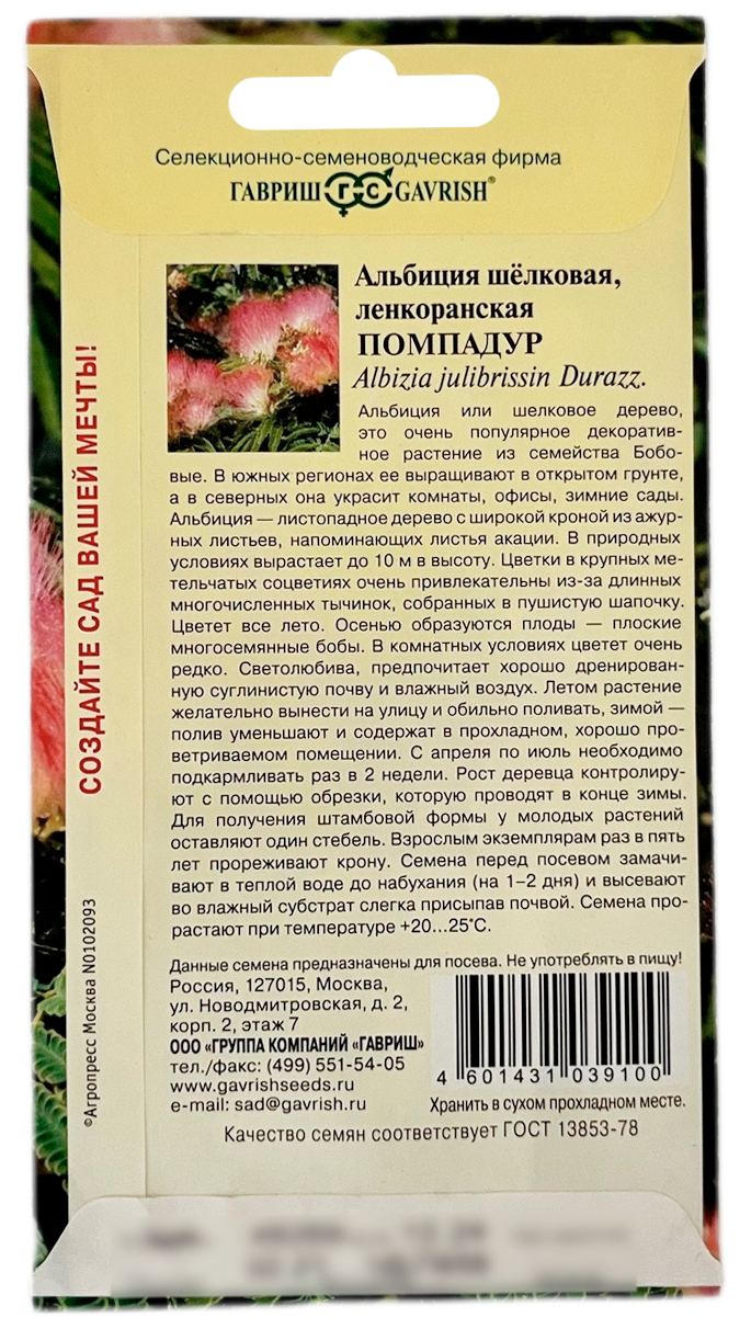 Альбиция щёлковая ленкоранская ПОМПАДУР ГАВРИШАльбиция или шелковое дерево очень популярное декоротивное растение из семейства Бобовые. В южных регионах ее выращивают в открытом грунте, а в северных она украсит комнаты, офисы, зимние сады. Альбиция — листопадное дерево с широкой кроной из ажурных листьев, напоминающих листья акации. В природных условиях вырастает до 10 м в высоту. Цветки в крупных метельчатых соцветиях очень привлекательны из-за длинных многочисленных тычинок, собранных в пушистую шапочку. Цветет все лето. Осенью образуются плоды — плоские многосемянные бобы. В комнатных условиях цветет очень редко. Светолюбива, предпочитает хорошо дренированную суглинистую почву и влажный воздух. Летом растение желательно вынести на улицу и обильно поливать, зимой — полив уменьшают и содержат в прохладном, хорошо проветриваемом помещении. С апреля по июль необходимо подкармливать раз в 2 недели. Рост деревца контролируют с помощью обрезки, которую проводят в конце зимы.