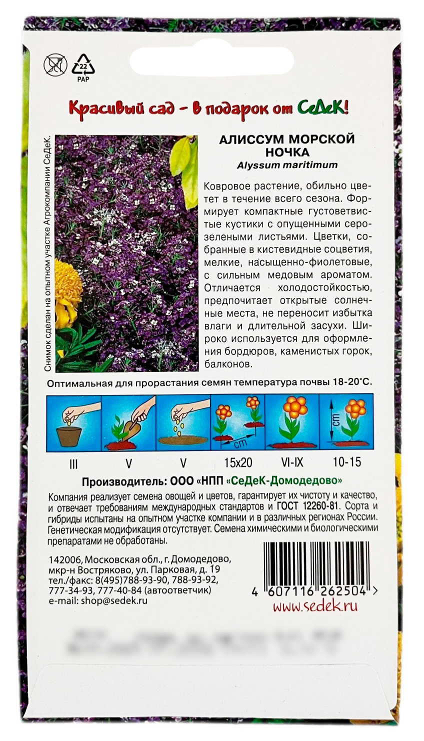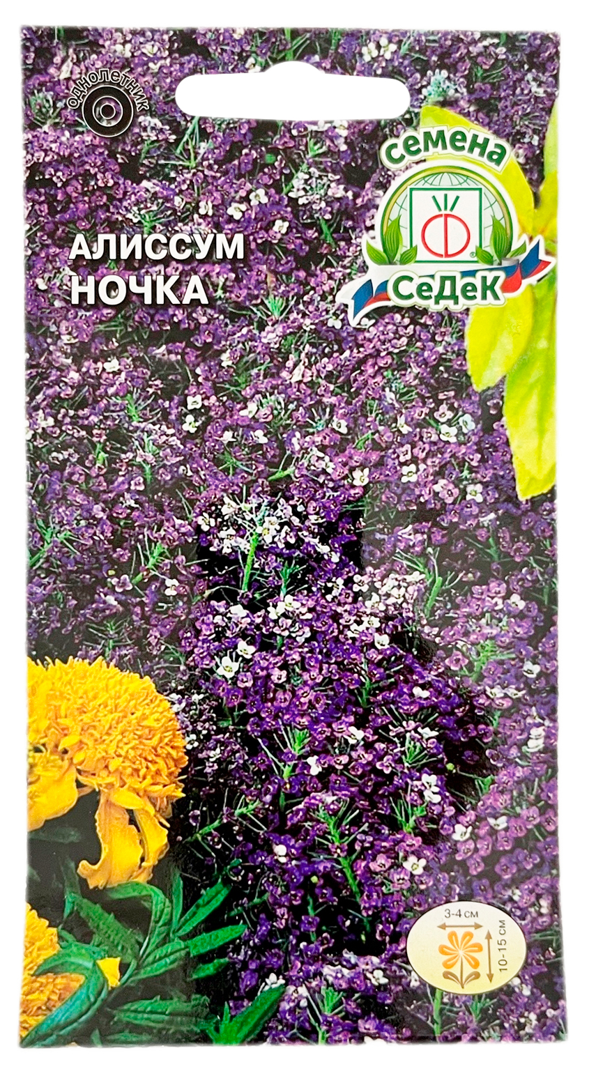 Алиссум морской НОЧКА СеДеККовровое растение, обильно цветущее в течение всего сезона. Формирует компактные, густо ветвистые кустики с опушенными, серо-зелеными листьями. Цветки мелкие, насыщенно-фиолетовые, с сильным медовым ароматом, собраны в кистевидные соцветия. Алиссум отличается холодостойкостью, предпочитает открытые солнечные места, не переносит избытка влаги и длительной засухи. Широко используется для оформления бордюров, каменистых горок, балконов.