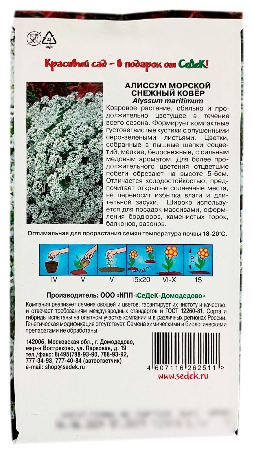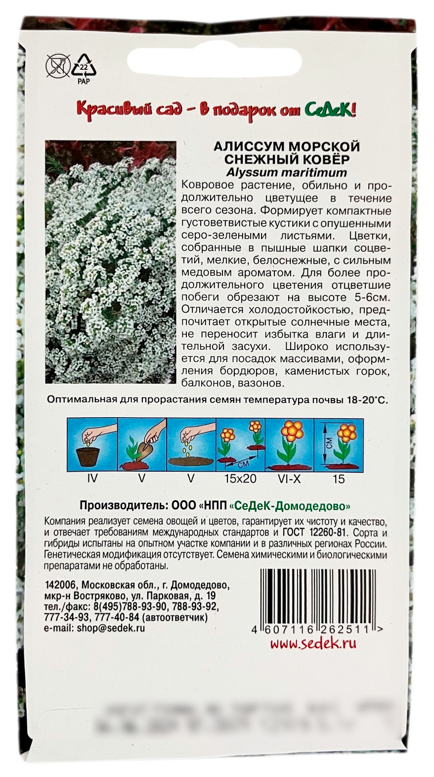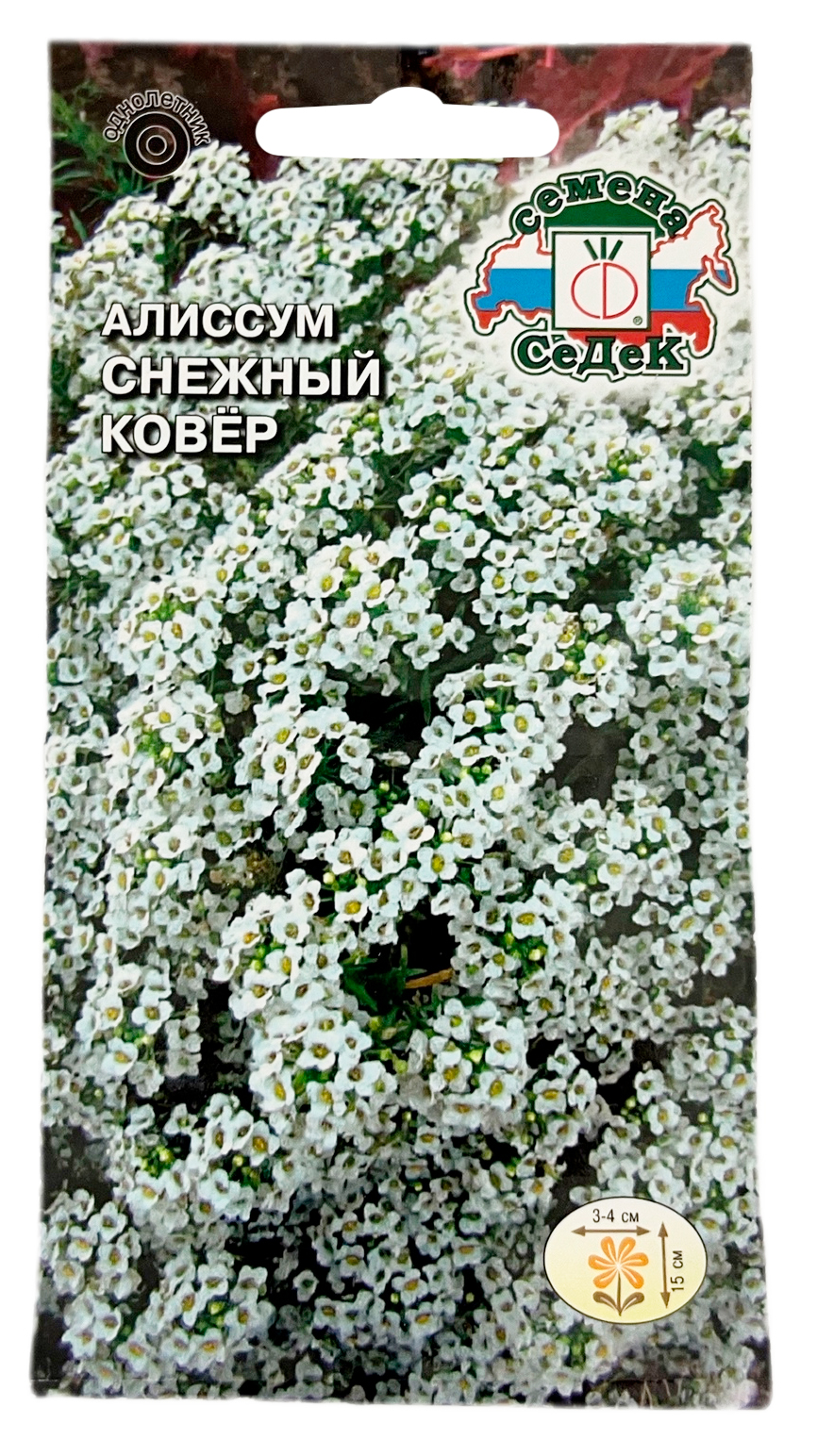 Алиссум морской СНЕЖНЫЙ КАВЕР СеДеККовровое растение, обильно и продолжительно цветущее в течение всего сезона. Формирует компактные густоветвистые кустики с опушенными серо-зелеными листьями. Цветки, собранные в пышные шапки соцветий, мелкие, белоснежные, с сильным медовым ароматом. Для более продолжительного цветения отцветшие побеги обрезают на высоте 5-6см. Отличается холодостойкостью, предпочитает открытые солнечные места, не переносит избытка влаги и длительной засухи. Широко используется для посадок массивами, оформления бордюров, каменистых горок, балконов, вазонов.