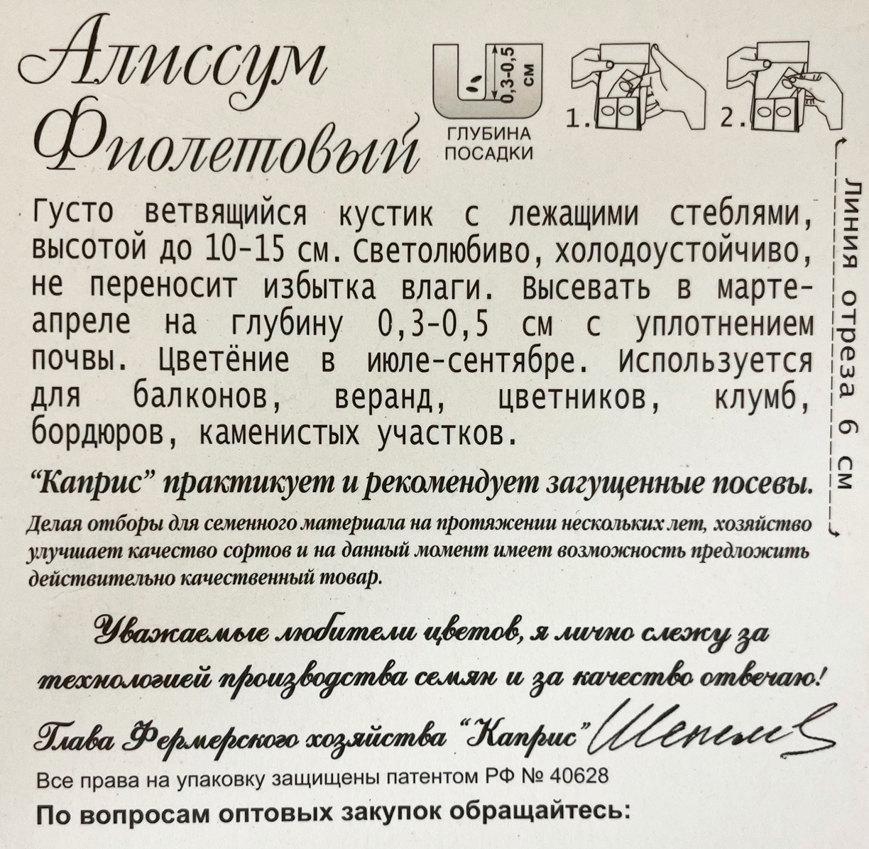 Алиссум Мускат фиолетовый 0,2гГусто ветвящийся кустик с лежащими стеблями, высотой до 10-15см.Светолюбиво, холодоустойчиво, не переносит избытка влаги. Высевать в марте-в апреле на глубину 0,3-0,5см,с уплотнением почвы. Цветёние в июле-сентябре. Используетсядля балконов, веранд, цветников, клумб, бордюров, каменистых участков.