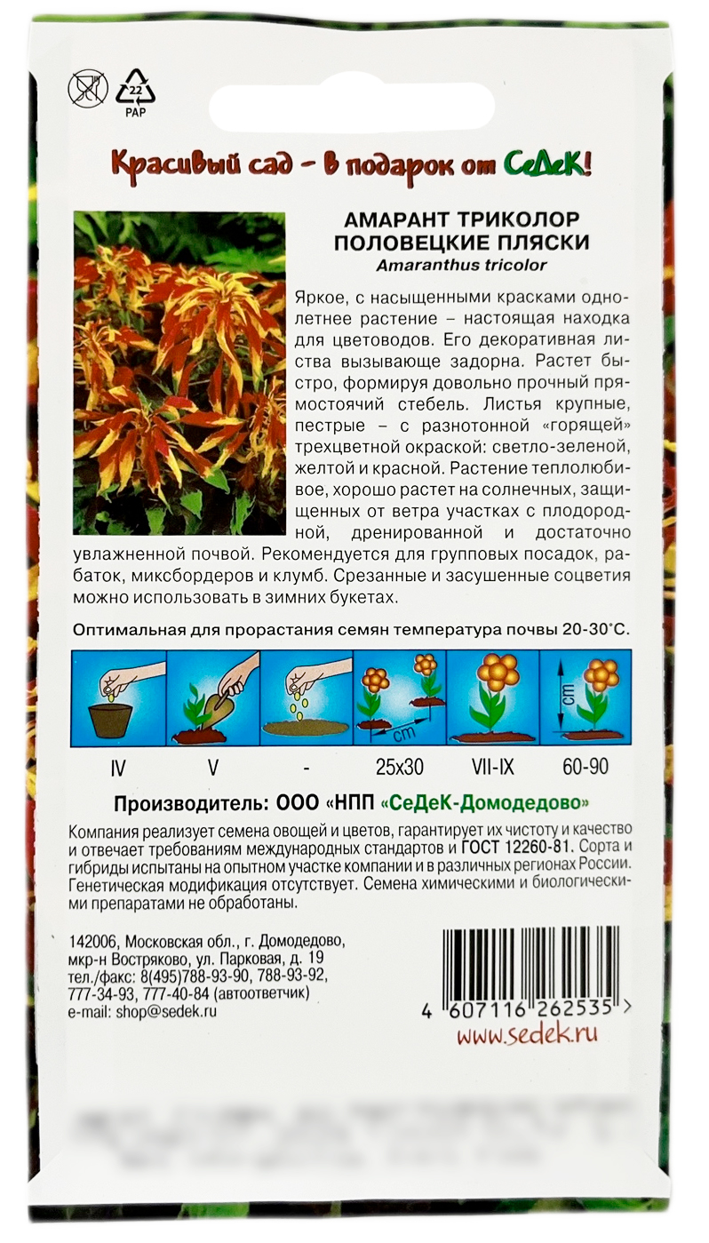 Амарант ТРИКОЛОР ПОЛОВЕЦКИЕ ПЛЯСКИ СеДеКЯркое, с насыщенными красками однолетнее растение – настоящая находка для цветоводов. Его декоративная листва вызывающе задорна. Растет быстро, формируя довольно прочный прямостоящий стебель. Листья крупные, пестрые - с разнотонной «горящей» трехцветной окраской: светло-зеленой, желтой и красной. Растение теплолюбивое, хорошо растет на солнечных, защищенных от ветра участках, с плодородной, дренированной и достаточно увлажненной почвой. Рекомендуется для групповых посадок, рабаток, миксбордеров и клумб. Срезанные и засушенные соцветия можно использовать в зимних букетах.