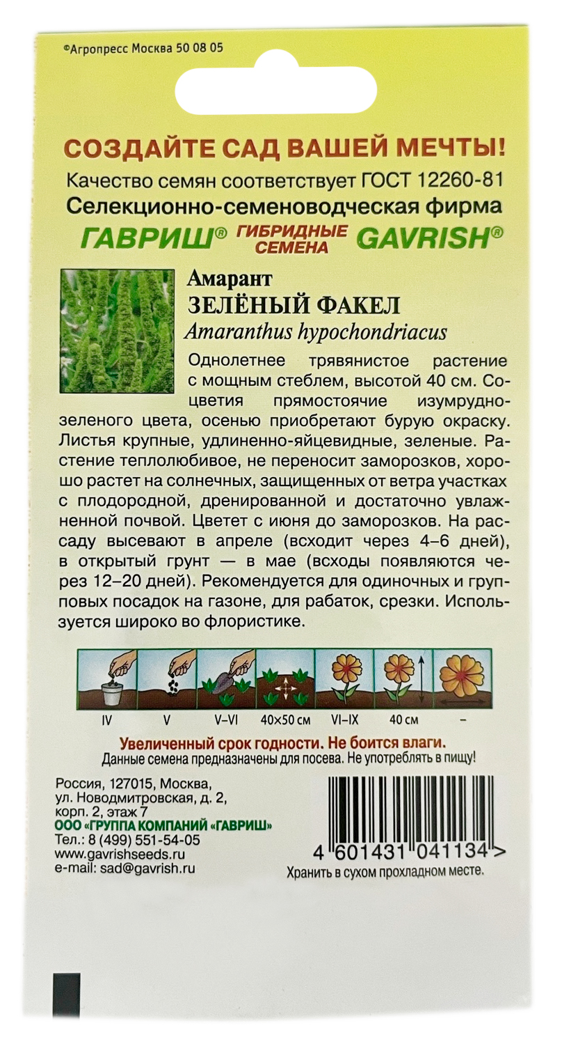 Амарант Зеленый факел ГАВРИШОднолетнее трявянистое растение c мощным стеблем, высотой 40 см. Соцветия прямостоячие изумрудно-зеленого цвета, осенью приобретают бурую окраску. Листья крупные, удлиненно-яйцевидные, зеленые. Растение теплолюбивое, не переносит заморозков, хорошо растет на солнечных, защищенных от ветра участках с плодородной, дренированной и достаточно увлажненной почвой. Цветет с июня до заморозков. На рассаду высевают в апреле (всходит через 4-6 дней), в открытый грунт - в мае (всходы появляются через 12-20 дней). Рекомендуется для одиночных и групповых посадок на газоне, для рабаток, срезки. Используется широко во флористике.