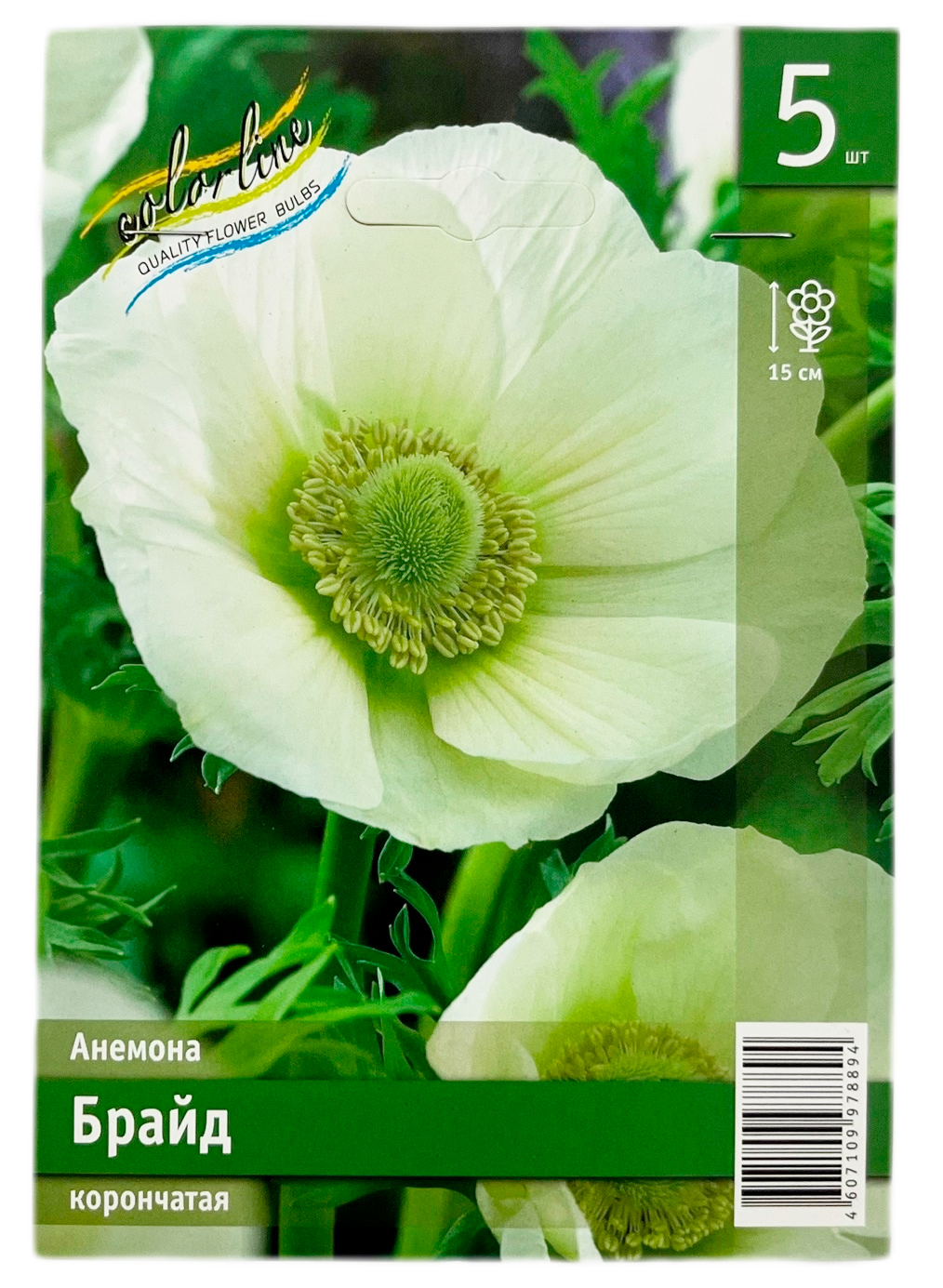 Анемона БРАЙД корончатаяАнемона представляет собой компактный кустик высотой от 15 до 30 см. Листья растения сидячие и рассеченные, имеют темно-зеленую окраску. Цветки этого сорта достигают размеров 18 см и имеют круглую форму. Они махровые, основной окраской цветов является белый цвет. Тычинки желто-зеленые.