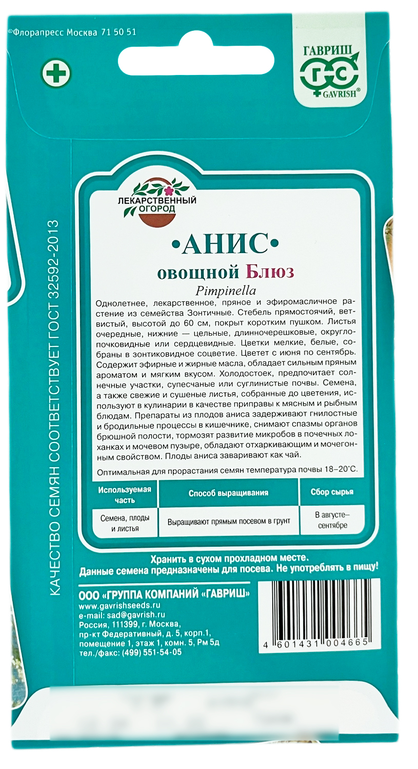 Анис овощной БЛЮЗ ГАВРИШОднолетнее лекарственное, пряное и эфиромасличное растение из семейства Зонтичные. Стебель прямостоячий ветвистый, высотой до 60 см, покрыт пушком. Листья очередные, длинночерешковые, округлосердцевидной формы, среднерассеченные с зубчатым краем. Цветки мелкие, белые, собраны в зонтиковидное соцветие. Цветет с июня по сентябрь. Холодостоек, предпочитает солнечные участки, супесчаные или суглинистые почвы. Семена, а также свежие и сушеные листья, собранные до цветения, используют в кулинарии в качестве приправы к мясным и рыбным блюдам.