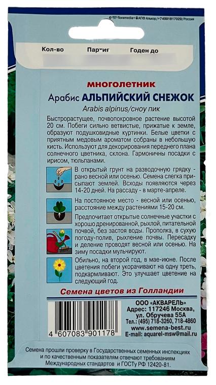 Арабис АЛЬПИЙСКИЙ СНЕЖОК АКВАРЕЛЬКомпактное стелющееся, высотой до 20 см, почвопокровное растение с белоснежными цветами, образующими пышные подушечки. Используют для оформления альпийских горок, бордюров, рабаток.