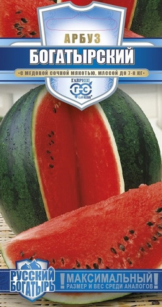 Арбуз Богатырский 1 г серия Русский богатырьСреднепоздний (90-95 дней от всходов до первого сбора плодов) сорт для выращивания в открытом грунте (южные регионы) и пленочных теплицах. Сочетает превосходное качество крупных плодов с высокой урожайностью даже в неблагоприятное лето. Растение мощное, плетистое, главная плеть более 5 м. Плод удлиненно-шаровидный, с рисунком из темно-зеленых, почти черных шиповатых полос, средняя масса — 5,2 кг (при хорошем уходе до 7-8 кг). Кора тонкая, кожистая. Мякоть ярко-красная, мелкозернистая, медовая, сочная, с насыщенным арбузным ароматом. Сорт устойчив к основным заболеваниям, плоды хорошо хранятся (3 месяца после съема плодов). Посев на рассаду производят в конце апреля. Высадку рассады — в конце мая – начале июня. Растения подвязывают к шпалере, до высоты 50 см удаляют все боковые побеги, последующие прищипывают над 1-3 листом. Возможно выращивание в свободной культуре в расстил. Схема посадки 70х150 см. Полив умеренный, особенно в период созревания плодов.