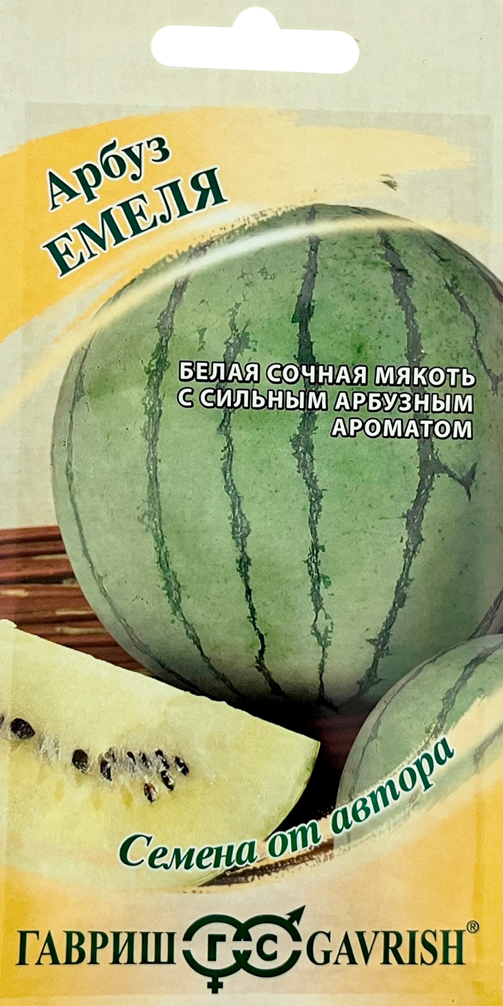 Арбуз ЕмеляРаннеспелый (от всходов до первого сбора плодов 60-65 дней) сорт. Растение среднеплетистое. Предназначено для выращивания в теплицах, под пленочными укрытиями и в открытом грунте (в южных регионах). Плоды округлые, массой 3-4 кг, с тонкой корой. Окраска фона светло-салатовая. Рисунок — узкие шиповатые полосы темно-зеленого цвета. Мякоть белая, зернистая, очень сладкая, сочная, с сильным арбузным ароматом. Вкусовые качества отличные. Товарная урожайность около 5 кг/кв.м. Устойчив к антракнозу.