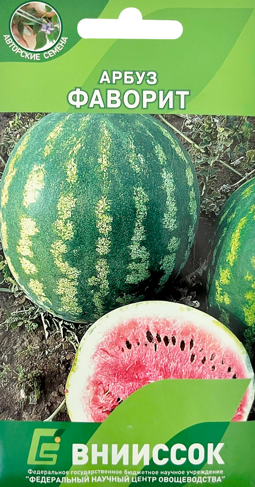 Арбуз ФаворитСорт арбуза среднего срока созревания. Вегетационный период 80- 85 дней. Плоды шаровидной формы. Средняя масса плода 8-12 кг. Окраска фона плода светло-зеленая с широкими темно-зелеными полосами. Мякоть розовая, зернистая, сочная, сладкая.