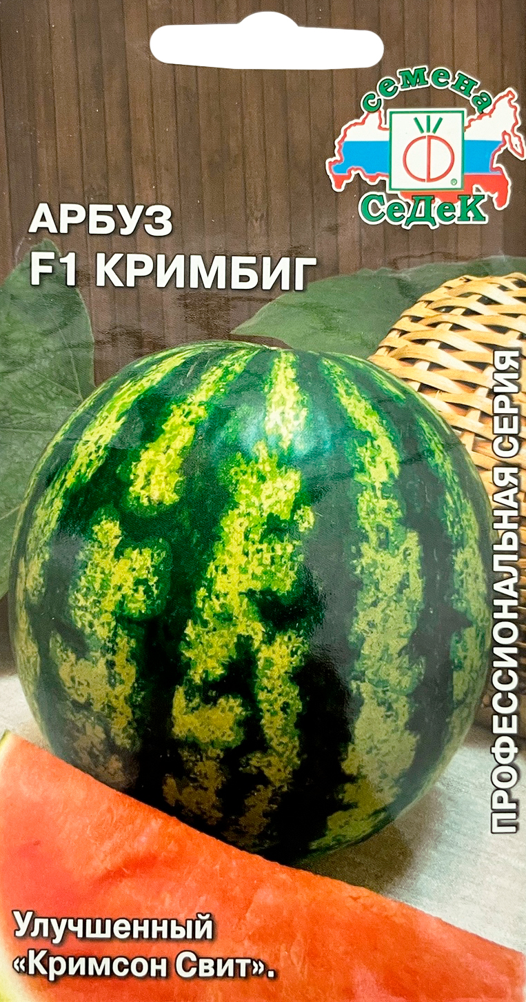 Арбуз Кримбиг F1Среднеспелый (от всходов до созревания плодов 85-95 дней) гибрид для открытого грунта и пленочных укрытий. Растение мощное, плетистое, хорошо облиственное. Плод округлый или слегка овальный, очень крупный, массой от 12-16 кг, кора толстая и прочная, зеленая с чёрно-зелеными средними полосками. Мякоть ярко-красная, сочная, хрустящая, сладкая. Урожайность с растения 30-35 кг. Ценность гибрида: устойчивость к фузариозу, крупноплодность, высокие вкусовые и товарные качества, транспортабельность, пригодность для хранения. Рекомендуется для использования в свежем виде, приготовления цукатов из арбузной корки.
