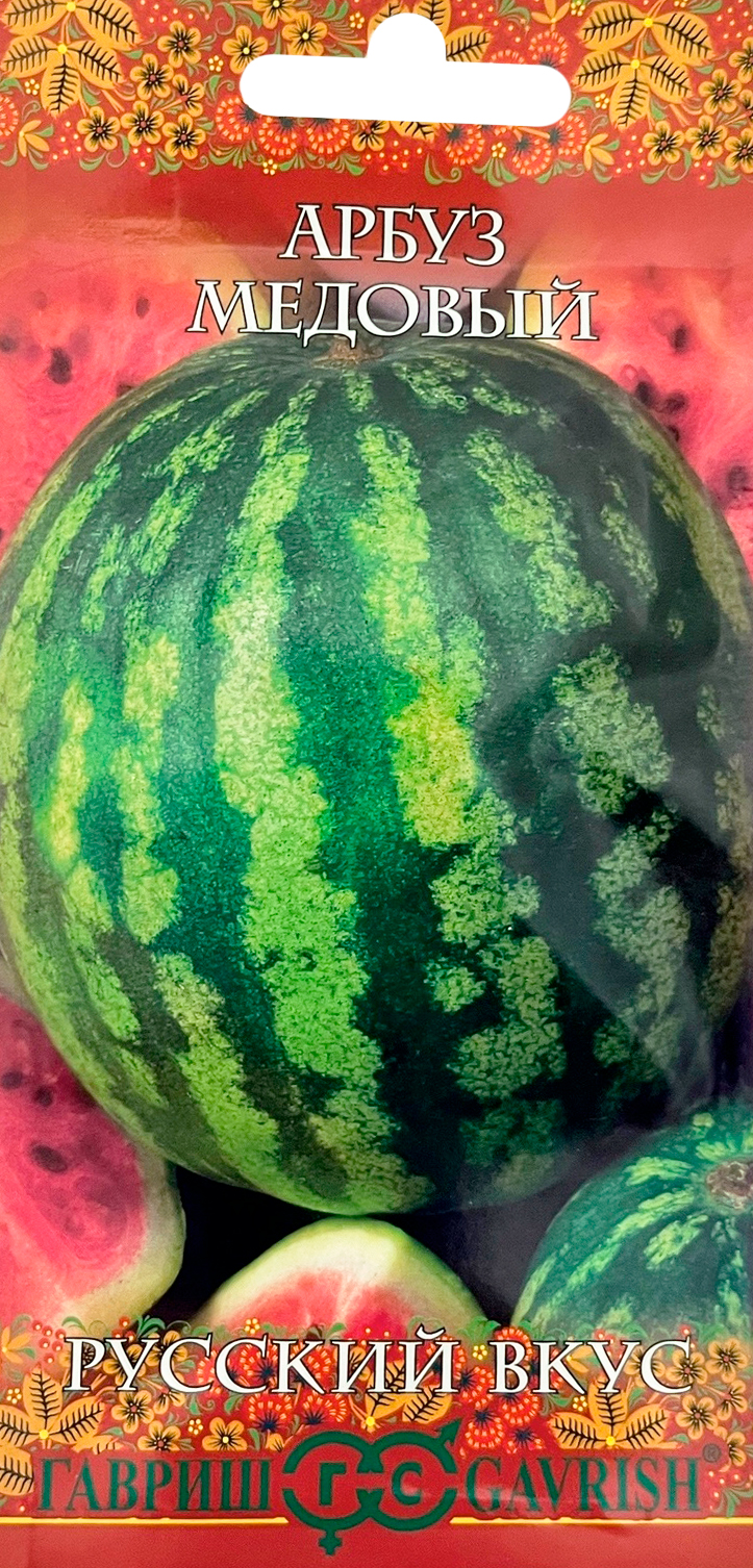 Арбуз Медовый серия Русский вкусРаннеспелый (82-105 дней от всходов до плодоношения) сорт. Растения длинноплетистые, со среднерассеченной листовой пластинкой. Плоды удлиненно-округлые, зеленые, с темно-зелеными полосами, массой 3-6 кг. Кора средней толщины. Мякоть красная, сахаристая, отличных вкусовых качеств. Семена средние, черные. Предназначен для выращивания в пленочных теплицах и открытом грунте. Посев на рассаду в конце апреля. Высадка рассады в конце мая &ndash, начале июня в возрасте 30-35 дней. Растения подвязывают к шпалере, до высоты 50 см удаляют все боковые побеги, последующие прищипывают над 1-3 листом. Возможно выращивание в свободной культуре врасстил. Полив умеренный, особенно в период созревания плодов. Схема посадки 70х150 см. Урожайность 7,1-7,7 кг/м2.