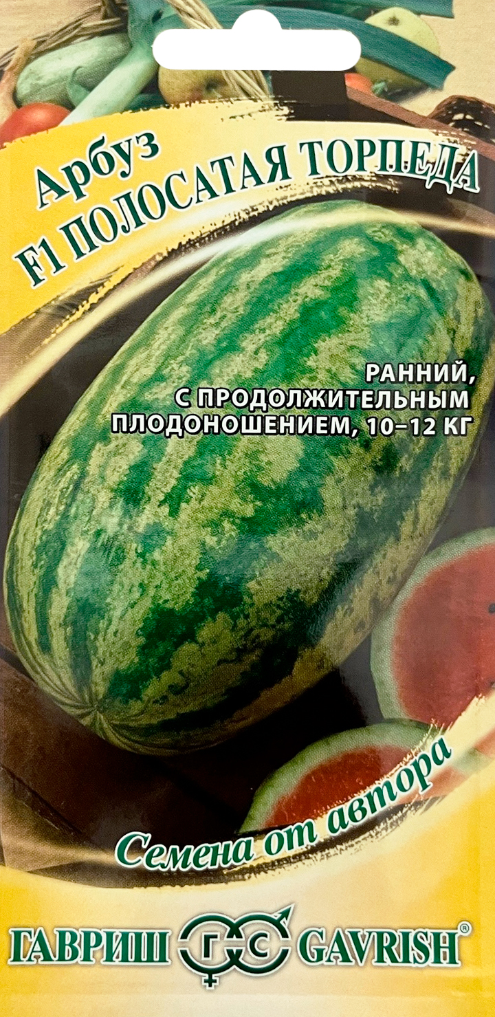 Арбуз Полосатая торпеда F1Ранний гибрид, подходит для выращивания в открытом грунте в средней полосе и на юге России. Растение плетистое, главная плеть средней длины до длинной. Плод продолговато-овальный, гладкий, темно-зеленый, с шиповатыми светло-зелеными полосами средней ширины. Масса плода 10-12 кг. Мякоть красная, нежная, сладкая. Гибрид отличается длительным плодоношением.Посев на рассаду производят в конце апреля. Высадку рассады в грунт— в конце мая – начале июня в возрасте 30-35 дней. Растения подвязывают к шпалере (до высоты 50 см), удаляют все боковые побеги, последующие прищипывают над 1-3 листом или выращивают врасстил.