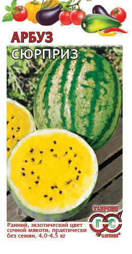 Арбузы с желтой мякотью редкие и дорогие гости на прилавках овощных магазинов, однако вырастить их из семян совсем несложно. Кубанские селекционеры создали арбуз Сюрприз, который прекрасно растет в средней полосе России (под пленочными укрытиями) и на юге. Сорт раннеспелый, это позволяет быстро формировать довольно крупные плоды массой 4,0-4,5 кг, даже если солнечных дней летом было мало. Мякоть ярко-желтая, практически не содержит семян, сладковатая, сочная. Кора тонкая, но на лежкости плодов это не отражается и после съема они прекрасно хранятся 2-3 месяца. Посев на рассаду производят в конце апреля. Высадку рассады в грунт — в конце мая – начале июня в возрасте 30-35 дней. Растения подвязывают к шпалере, до высоты 50 см удаляют все боковые побеги, последующие прищипывают над 1-3 листом или выращивают врасстил.Характеристики