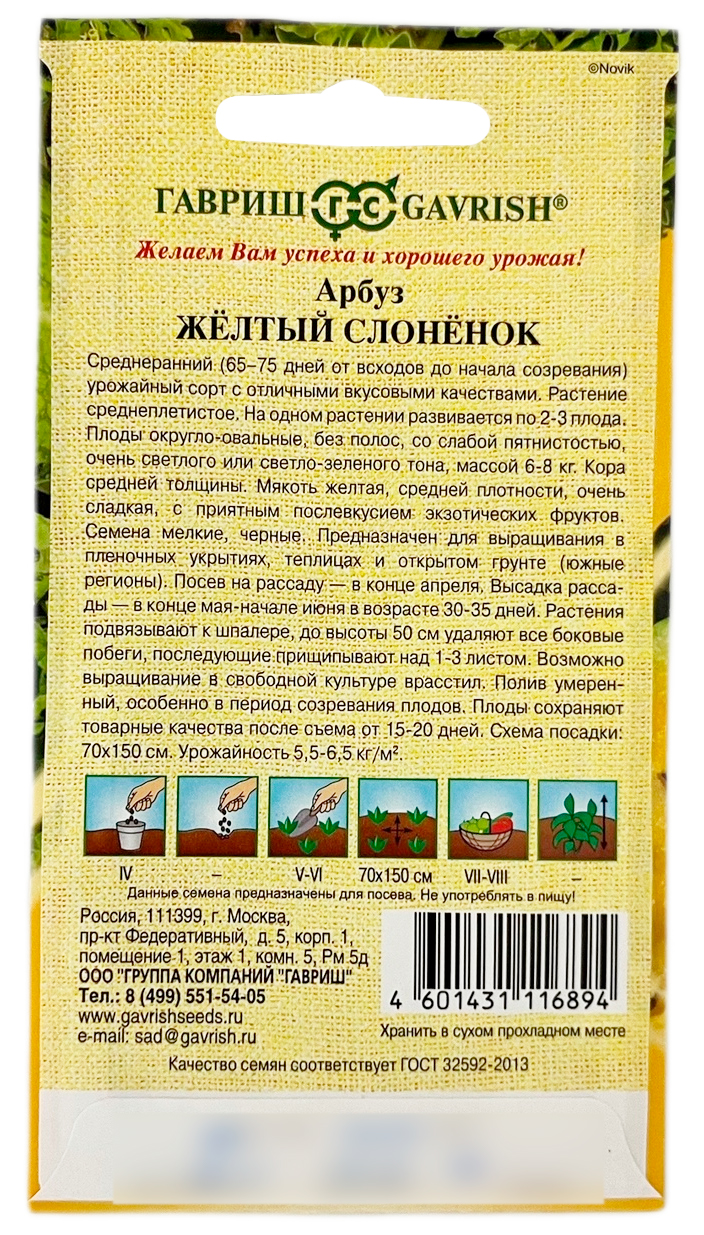 Арбуз ЖЁЛТЫЙ СЛОНЁНОК ГАВРИШСреднеранний (65–75 дней от всходов до начала созревания) урожайный сорт с отличными вкусовыми качествами. Растение среднеплетистое. На одном растении развивается по 2-3 плода. Плоды округло-овальные, без полос, со слабой пятнистостью очень светлого или светло-зеленого тона, массой 6-8 кг. Кора средней толщины. Мякоть желтая, средней плотности, очень сладкая, с приятным послевкусием экзотических фруктов. Семена мелкие, черные. Предназначен для выращивания в пленочных укрытиях, теплицах и открытом грунте (южные регионы). Посев на рассаду — в конце апреля. Высадка рассады — в конце мая–начале июня в возрасте 30–35 дней. Растения подвязывают к шпалере, до высоты 50 см удаляют все боковые побеги, последующие прищипывают над 1–3 листом. Возможно выращивание в свободной культуре врасстил. Полив умеренный, особенно в период созревания плодов. Плоды сохраняют товарные качества после съема от 15-20 дней. Схема посадки: 70х150 см. Урожайность 5,5–6,5 кг/м2.