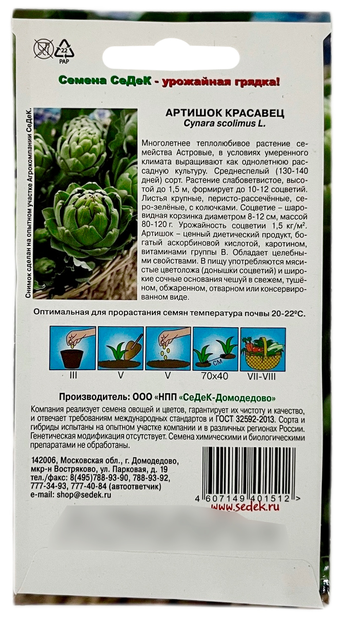 Артишок КРАСАВЕЦ СеДеКМноголетнее теплолюбивое растение семейства Астровые, в условиях умеренного климата выращивают как однолетнюю рассадную культуру. Среднеспелый (130-140 дней) сорт. Растение слабоветвистое, высотой до 1,5 м, формирует до 10-12 соцветий. Листья крупные, перисто-рассечённые, серо-зелёные, с колючками. Соцветие – шаровидная корзинка диаметром 8-12 см, массой 80-120 г. Урожайность соцветии 1,5 кг/м2. Артишок – ценный диетический продукт, богатый аскорбиновой кислотой, каротином, витаминами группы В. Обладает целебными свойствами. В пищу употребляются мясистые цветоложа (донышки соцветий) и широкие сочные основания чешуй в свежем, тушёном, обжаренном, отварном или консервированном виде.