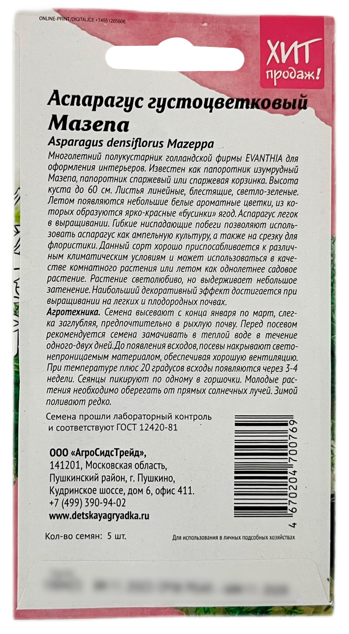 Аспарагус густоцветковый МАЗЕПА АгроСидсТрейдМноголетний полукустарник голландской фирмы EVANTHIA для оформления интерьеров. Известен как папоротник изумрудный Мазепа, папоротник спаржевый или спаржевая корзинка. Высота куста до 60 см. Листья линейные, блестящие, светло-зеленые. Летом появляются небольшие белые ароматные цветки, из которых образуются ярко-красные «бусинки» ягод. Аспарагус легок в выращивании. Гибкие ниспадающие побеги позволяют использовать аспарагус как ампельную культуру, так и на срезку для флористики. Данный сорт хорошо приспосабливается к различным климатическим условиям и может использоваться в качестве комнатного растения или летом как однолетнее садовое растение. Растение светолюбиво, но выдерживает небольшое затенение. Наибольший декоративный эффект достигается при выращивании на легких и плодородных почвах.