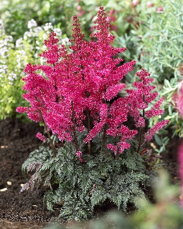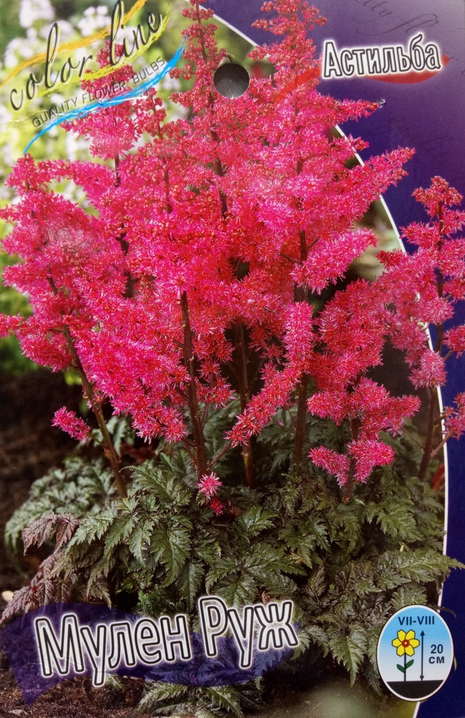 Астильба Moulin Rouge (Мулен Руж). Миниатюрный сорт астильбы. Высота растения 15-20 см. Листья рассеченные, кружевные, весной с бронзовым отливом. Соцветия в виде ярких карминовых метелок, широкопирамидальные, плотные. Уникальная по цвету в этой группе.Характеристики