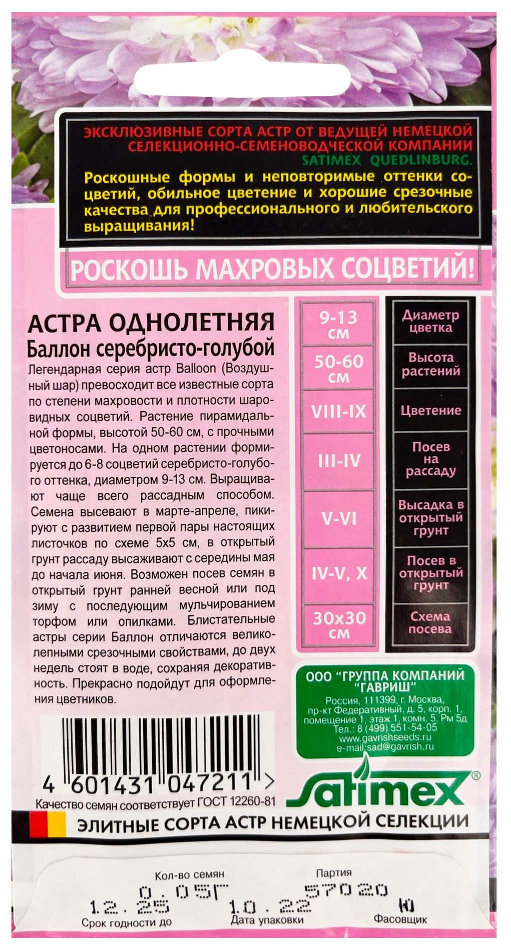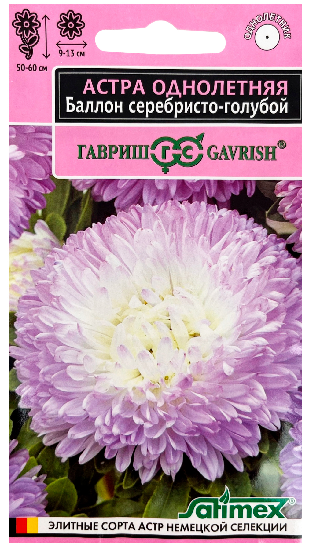 Астра Баллон серебристо-голубой, однолетняя (густомахровая)* 0,05 г серия ЭксклюзивЛегендарная серия астр Balloon (Воздушный шар) превосходит все известные сорта по степени махровости и плотности шаровидных соцветий. Растение пирамидальной формы, высотой 50-60 см с прочными цветоносами. На одном растении формируется до 6-8 соцветий серебристо-голубого оттенка, диаметром 9-13 см. Выращивают чаще всего рассадным способом. Семена высевают в марте-апреле, пикируют с развитием первой пары настоящих листочков по схеме 5х5 см, в открытый грунт рассаду высаживают с середины мая до начала июня. Возможен посев семян в открытый грунт ранней весной или под зиму с последующим мульчированием торфом или опилками. Блистательные астры серии Баллон отличаются великолепными срезочными свойствами, до двух недель стоят в воде, сохраняя декоративность. Прекрасно подойдут для оформления цветников.