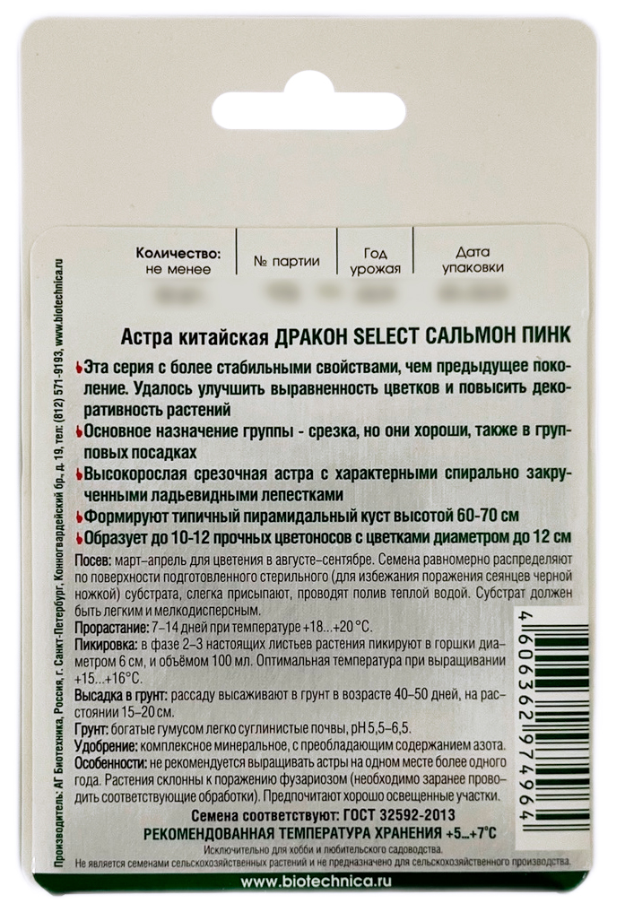 Астра китайская ДРАКОН САЛЬМАОН ПИНК БиотехникаВысокорослая срезочная астра с характерными спирально закрученными ладьевидными лепестками. Формируют типичный пирамидальный куст высотой 60-70 см. Образует до 10-12 прочных цветоносов с цветками диаметром до 12 см.