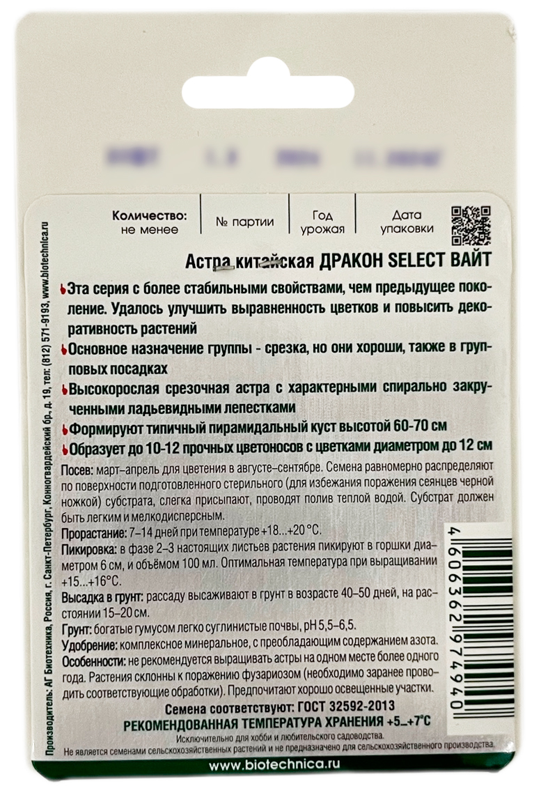 Астра китайская ДРАКОН ВАЙТ БиотехникаВысокорослая срезочная астра с характерными спирально закрученными ладьевидными лепестками. Формируют типичный пирамидальный куст высотой 60-70 см. Образует до 10-12 прочных цветоносов с цветками диаметром до 12 см.