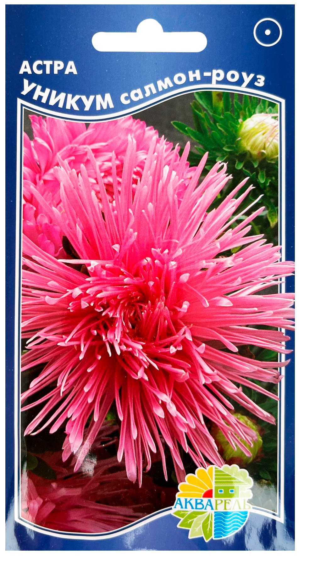 Астра УНИКУМ салмон - роуз АКВАРЕЛЬВысоко декоративный сорт однолетних астр высотой 60 см. Куст широкий, ветвистый. Соцветия лучистые, изящные, махровые, диаметром до 12 см лососево - розового цвета. Язычковые цветки узкие, скручены по длине в трубочку, расположены горизонтально, полностью закрывают центральный диск.