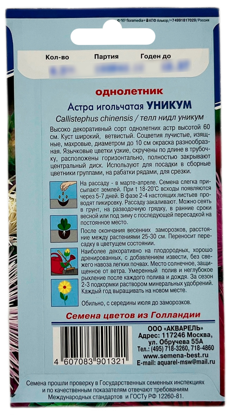 Астра игольчатая УНИКУМ АКВАРЕЛЬВысокодекоративный сорт однолетних астр, высотой 60 см. Куст широкий, ветвистый. Соцветия лучистые, изящные, махровые, окраска разнообразная, диаметром до 10 см. Язычковые цветки узкие, скручены по длине в трубочку, расположены горизонтально, полностью закрывают центральные трубчатые. Используют для обсадки и на срезку.