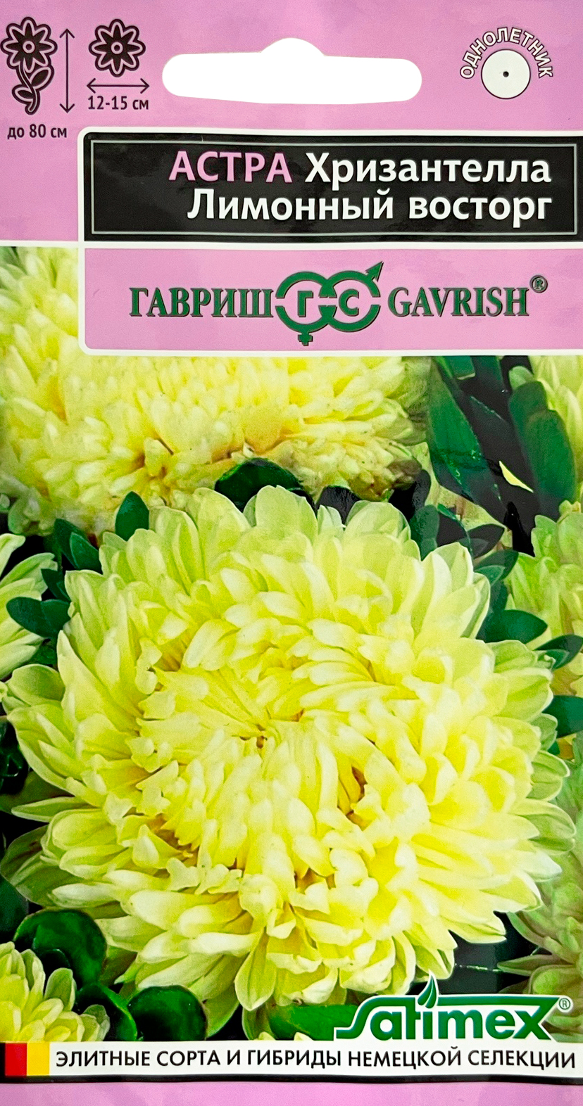 Астра Хризантелла Лимонный восторг Н20Инновационное направление современной селекции – Хризантеллы, гармонично объединившие жизненную силу и красоту астр и хризантем. Растение однолетнее, высотой 60-80 см с мощным толстым стеблем, формирует на одном кусте по 10-15 цветоносов второго порядка. Цветы плотные, крупные (12-15 см в диаметре), нежно- лимонного окраса, с великолепной формой от полусферической до шаровидной. Лепестки ладьевидные, жесткие загнуты к верху. Не повреждаются дождем! Высокое качество и плотность цветков позволяют получать профессиональную срезку для букетов. Выращивают рассадным способом. Для цветения в августе – сентябре семена высевают в апреле начале мая. Семена не заглублять! Прорастание при температуре 15-16 град. Пикируют в фазе 2-3 настоящих листочков в отдельные горшки. Оптимальная температура выращивания 14-16 град. В открытый грунт рассаду высаживают в возрасте 40-50 дней. По схеме 15х20 см.