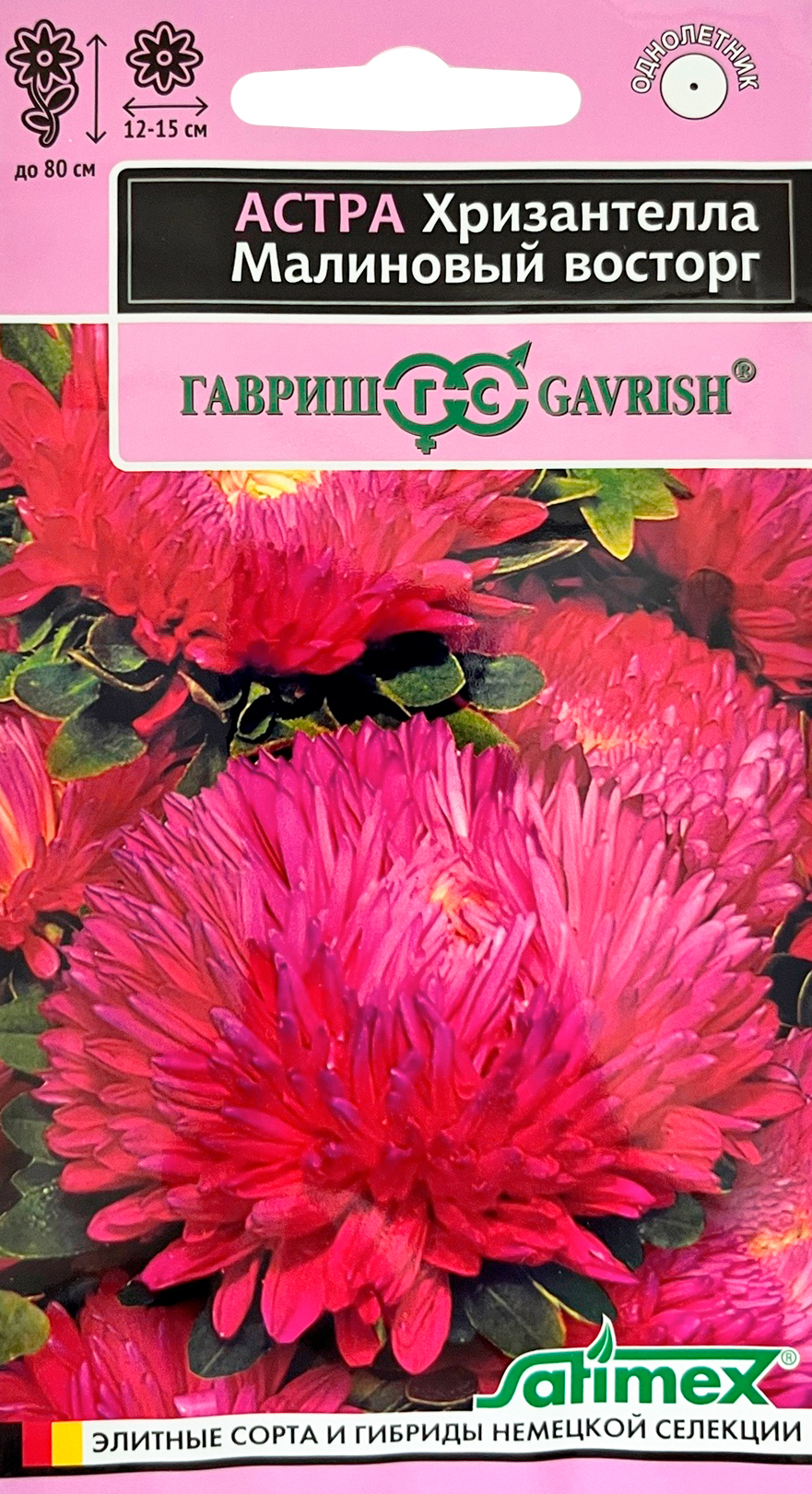 Астра Хризантелла Малиновый восторг, Гавриш, SatimexИнновационное направление современной селекции – Хризантеллы, гармонично объединившие жизненную силу и красоту астр и хризантем. Растение однолетнее, высотой 60-80 см с мощным толстым стеблем, формирует на одном кусте по 10-15 цветоносов второго порядка. Цветы плотные, крупные (12-15 см в диаметре), малинового окраса, с великолепной формой от полусферической до шаровидной. Лепестки ладьевидные, жесткие загнуты к верху. Не повреждаются дождем! Высокое качество и плотность цветков позволяют получать профессиональную срезку для букетов. Выращивают рассадным способом. Для цветения в августе – сентябре семена высевают в апреле начале мая. Семена не заглублять! Прорастание при температуре 15-16 град. Пикируют в фазе 2-3 настоящих листочков в отдельные горшки. Оптимальная температура выращивания 14-16 град. В открытый грунт рассаду высаживают в возрасте 40-50 дней. По схеме 15х20 см.