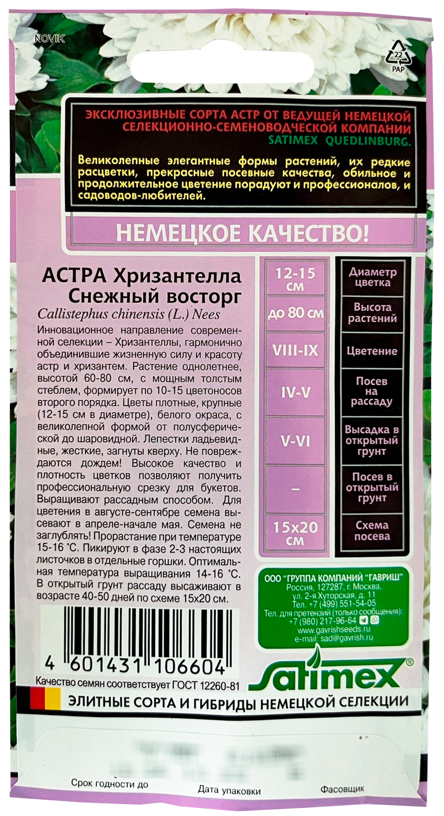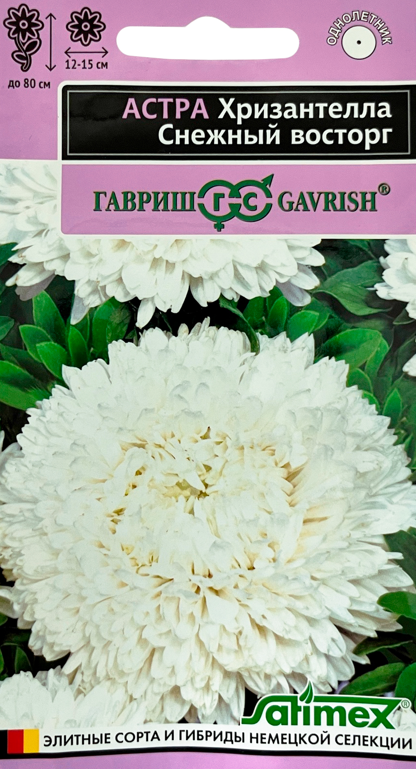 Астра Хризантелла Снежный восторг Н20Инновационное направление современной селекции – Хризантеллы, гармонично объединившие жизненную силу и красоту астр и хризантем. Растение однолетнее, высотой 60-80 см с мощным толстым стеблем, формирует на одном кусте по 10-15 цветоносов второго порядка. Цветы плотные, крупные (12-15 см в диаметре), белого окраса, с великолепной формой от полусферической до шаровидной. Лепестки ладьевидные, жесткие загнуты к верху. Не повреждаются дождем! Высокое качество и плотность цветков позволяют получать профессиональную срезку для букетов. Выращивают рассадным способом. Для цветения в августе – сентябре семена высевают в апреле начале мая. Семена не заглублять! Прорастание при температуре 15-16 град. Пикируют в фазе 2-3 настоящих листочков в отдельные горшки. Оптимальная температура выращивания 14-16 град. В открытый грунт рассаду высаживают в возрасте 40-50 дней. По схеме 15х20 см.
