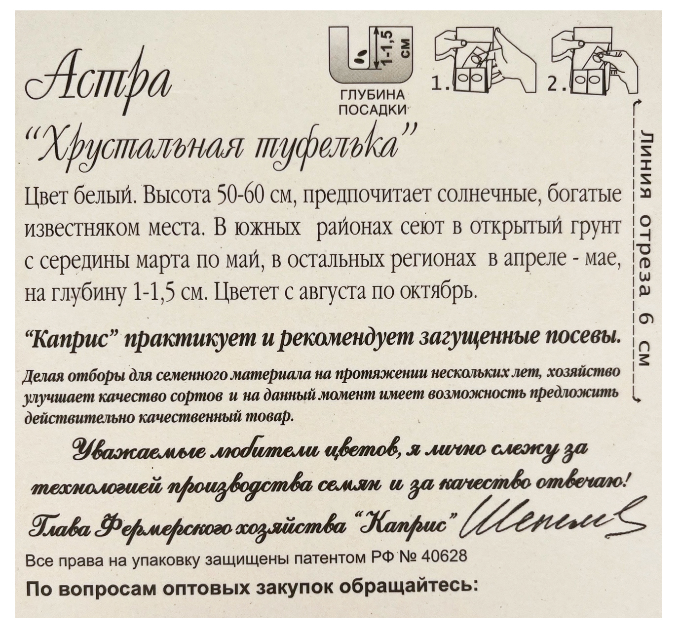 АСТРА ХРУСТАЛЬНАЯ ТУФЕЛЬКА КАПРИСБелая. Высота 55-65см, предпочитает солнечные, богатые известняком места. В южных районах сеют в открытый грунт с середины марта по май, в остальных регионах в марте-апреле, на глубину 1-1,5см. Рассаду высаживать в возрасте 45-50 дней, при температуре 16-18 градусов. Цветет с августа по октябрь.