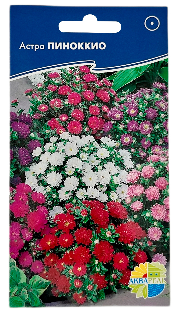 Астра ПИНОККИО АКВАРЕЛЬСорт карликовых однолетних астр, высотой 20 см. Куст компактный, шаровидной формы с многочисленными (до 5 см), махровыми соцветиями, смесь окрасок. Используют для оформления бордюров, переднего плана сборных цветников, для озеленения балконов.