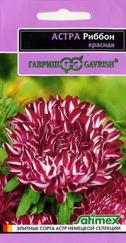 Карминно-красные пионовидные соцветия диаметром 8-10 см с ярким акцентом — белой продольной полосой на язычковых цветках. Куст компактный с прочными цветоносами, высотой 30 см. Цветение раннее, обильное и продолжительное. Для выращивания подходят хорошо освещенные участки с плодородной суглинистой или супесчаной почвой. Выращивают чаще всего рассадным способом. Семена высевают в марте-апреле, пикируют с развитием первой пары настоящих листочков по схеме 5х5 см, в открытый грунт рассаду высаживают с середины мая до начала июня. Возможен посев семян в открытый грунт ранней весной или под зиму с последующим мульчированием торфом или опилками. Низкорослые астры серии Риббон станут достойным украшением ваших балконов, вазонов, бордюров, цветников и патио-садиков.Характеристики