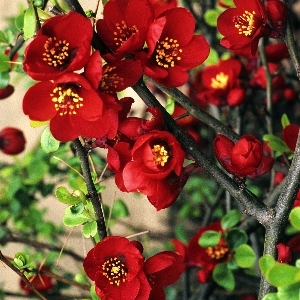 Раскидистый кустарник. Крона широко округлая, плотная. Цветёт в мае красными крупными цветками с жёлтыми тычинками. Плоды съедобные.Характеристики