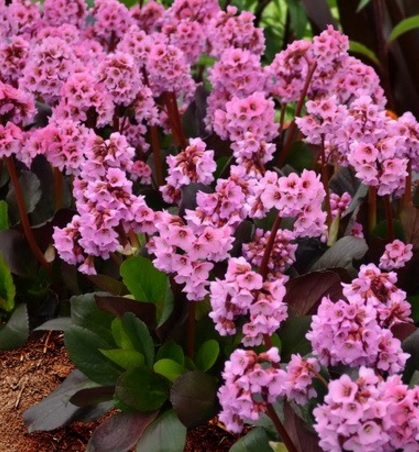 Бадан "Spring Fling"Очень обильно цветёт (можно спутать с цветением азалии), цветки крупные , ярко-розовые, на толстых красных цветоносах, листва плотная, блестящая, бронзового цвета.