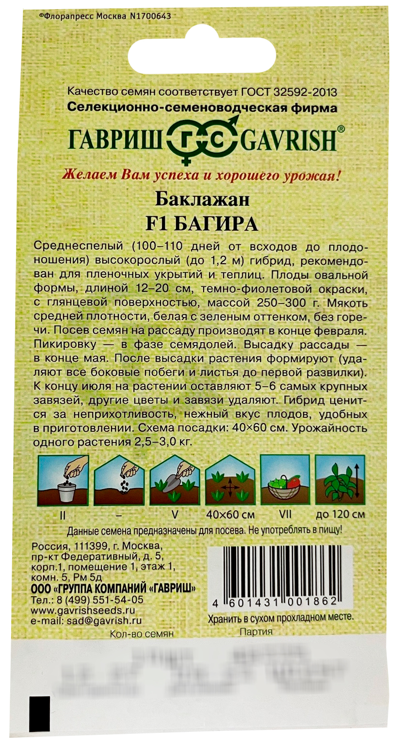Баклажан Багира F1Среднеспелый (100-110 дней от всходов до плодоношения) высокорослый (до 1,2 м) гибрид, рекомендован для пленочных укрытий и теплиц. Плоды овальной формы, длиной 12-20 см, темно-фиолетовой окраски, с глянцевой поверхностью, массой 250-300 г. Мякоть средней плотности, белая с зеленым оттенком, без горечи. Посев семян на рассаду производят в конце февраля. Пикировку — в фазе семядолей. Высадку рассады - в конце мая. После высадки растения формируют (удаляют все боковые побеги и листья до первой развилки). К концу июля на растении оставляют 5-6 самых крупных завязей, другие цветы и завязи удаляют. Гибрид ценится за неприхотливость, нежный вкус плодов, удобных в приготовлении. Схема посадки: 40x60 см. Урожайность одного растения 2,5-3,0 кг.