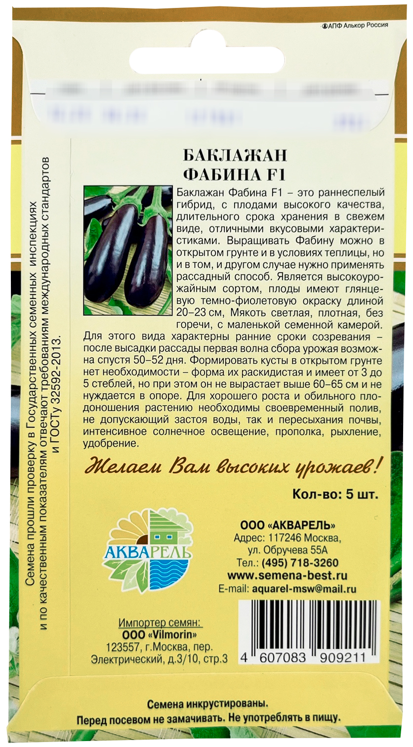 Баклажан Фабина F1 АКВАРЕЛЬРаннеспелый гибрид, с плодами высокого качества, длительного срока хранения в свежем виде, отличными вкусовыми характеристиками. Выращивать Фабину можно в открытом грунте и в условиях теплицы, но и в том, и другом случае нужно применять рассадный способ. Является высокоурожайным сортом, плоды имеют глянцевую темно-фиолетовую окраску длиной 20-23 см, Мякоть светлая, плотная, без горечи, с маленькой семенной камерой. Для этого вида характерны ранние сроки созревания – после высадки рассады первая волна сбора урожая возможна спустя 50-52 дня. Формировать кусты в открытом грунте нет необходимости – форма их раскидистая и имеет от 3 до 5 стеблей, но при этом он не вырастает выше 60-65 см и не нуждается в опоре. Для хорошего роста и обильного плодоношения растению необходимы своевременный полив, не допускающий застоя воды, так и пересыхания почвы, интенсивное солнечное освещение, прополка, рыхление, удобрение.