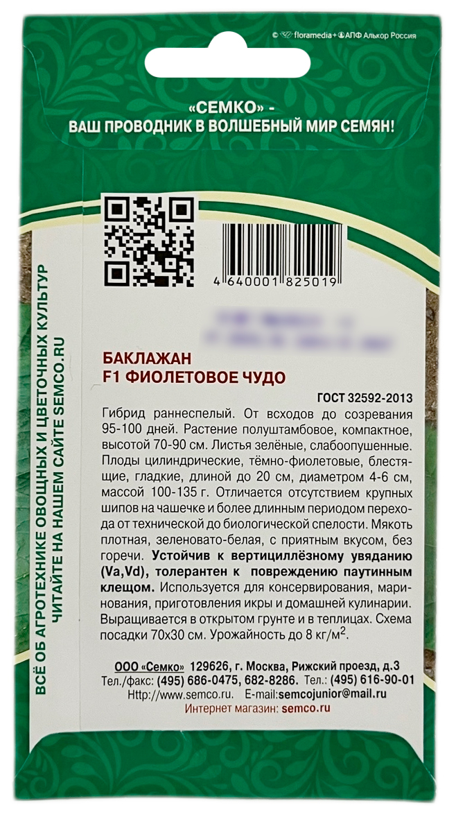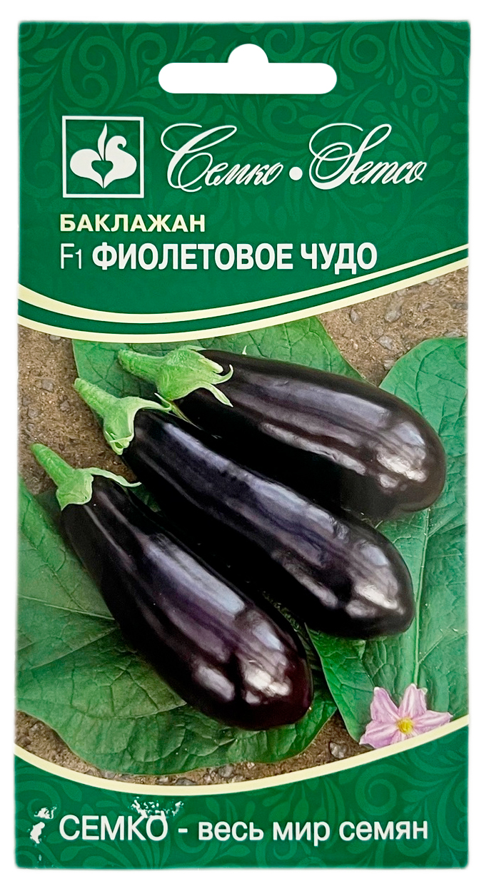 Баклажан ФИОЛЕТОВОЕ ЧУДО СЕМКОБаклажан Фиолетовое Чудо F1 - ранний гибрид для выращивания в открытом и защищенном грунте. От всходов до созревания 95–100 дней. Растение полуштамбовое, компактное, высотой 70–90 см. Листья зеленые, слабоопушенные. Баклажаны цилиндрические, темно-фиолетовые, блестящие, гладкие, длиной до 20 см, диаметром 4–6 см, массой 100–135 г. Отличается отсутствием крупных шипов на чашечке и более длинным периодом перехода от технической до биологической спелости. Мякоть плотная, зеленовато-белая, с приятным вкусом, без горечи. Баклажан Фиолетовое Чудо F1 устойчив к вертициллезному увяданию (Va, Vd), толерантен к повреждению паутинным клещом. Используется для консервирования, маринования, приготовления икры и домашней кулинарии. Предназначен для выращивания в открытом грунте и в теплицах. Густота посадки 5–6 растений/м2. Схема посадки 70х30 см. Урожайность до 8 кг/м2.