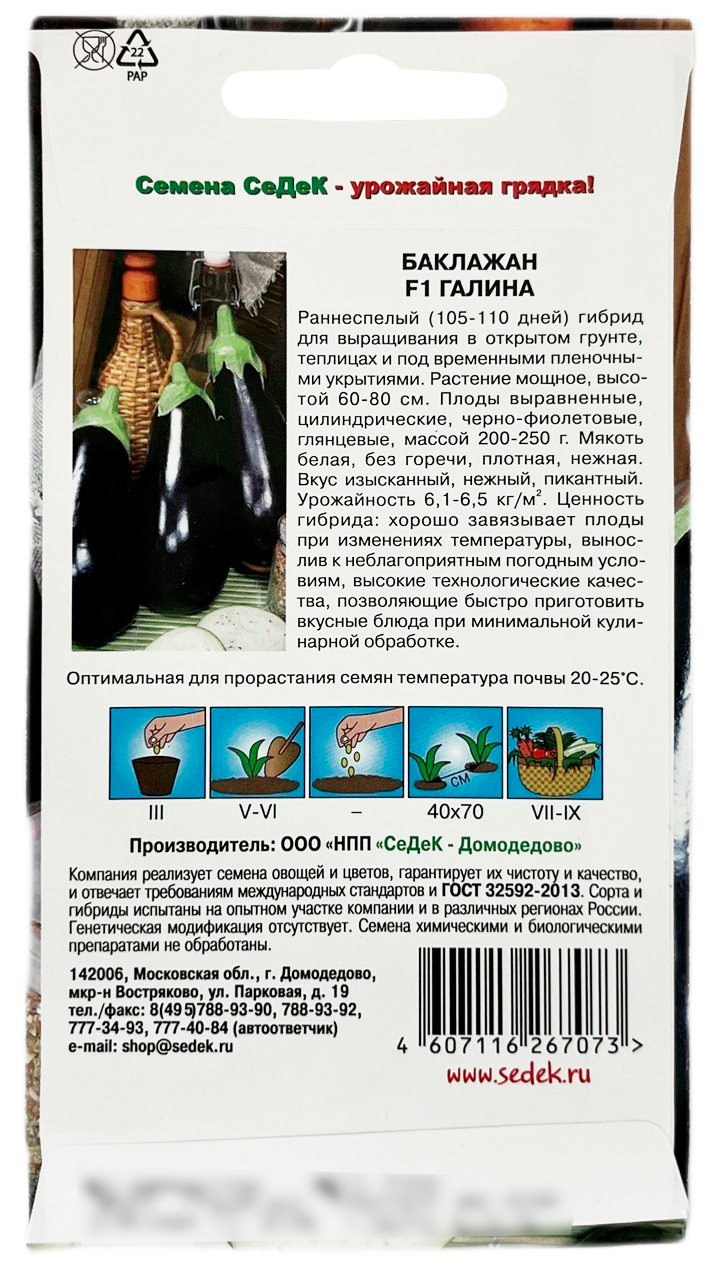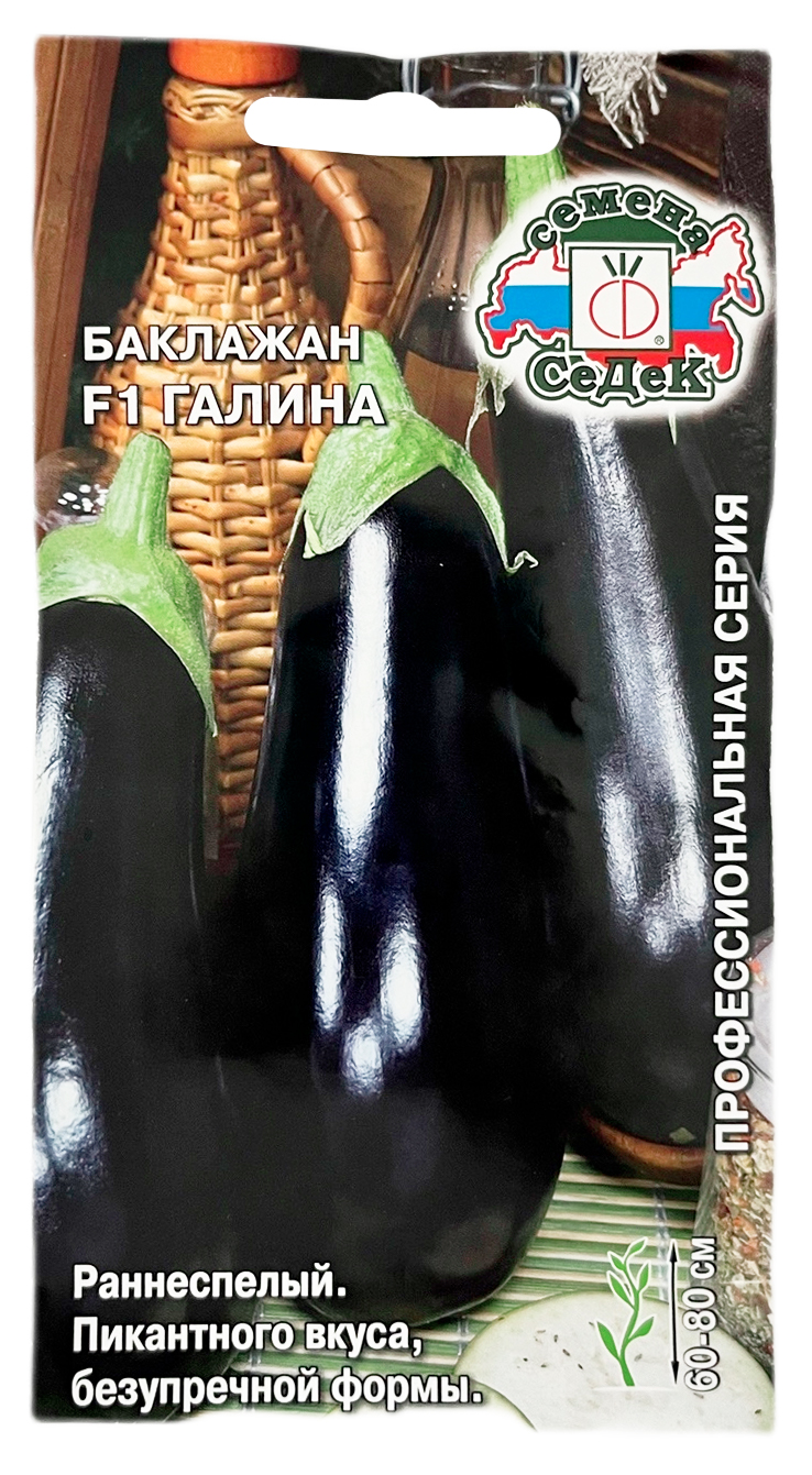 Баклажан ГАЛИНА СеДеКРаннеспелый (105-110 дней) гибрид для выращивания в открытом грунте, теплицах и под временными пленочными укрытиями. Растение мощное, высотой 60-80 см. Плоды выравненные, овально-грушевидные, черно-фиолетовые, глянцевые, массой 200-250 г. Мякоть беловатая, без горечи, не плотная, нежная. Вкус изысканный, нежный, пикантный. Урожайность 6,1-6,5 кг/кв.м. Ценность гибрида: хорошо завязывает плоды при изменениях температуры, вынослив к неблагоприятным погодным условиям, высокие технологические качества, позволяющие быстро приготовить вкусные блюда при минимальной кулинарной обработке.