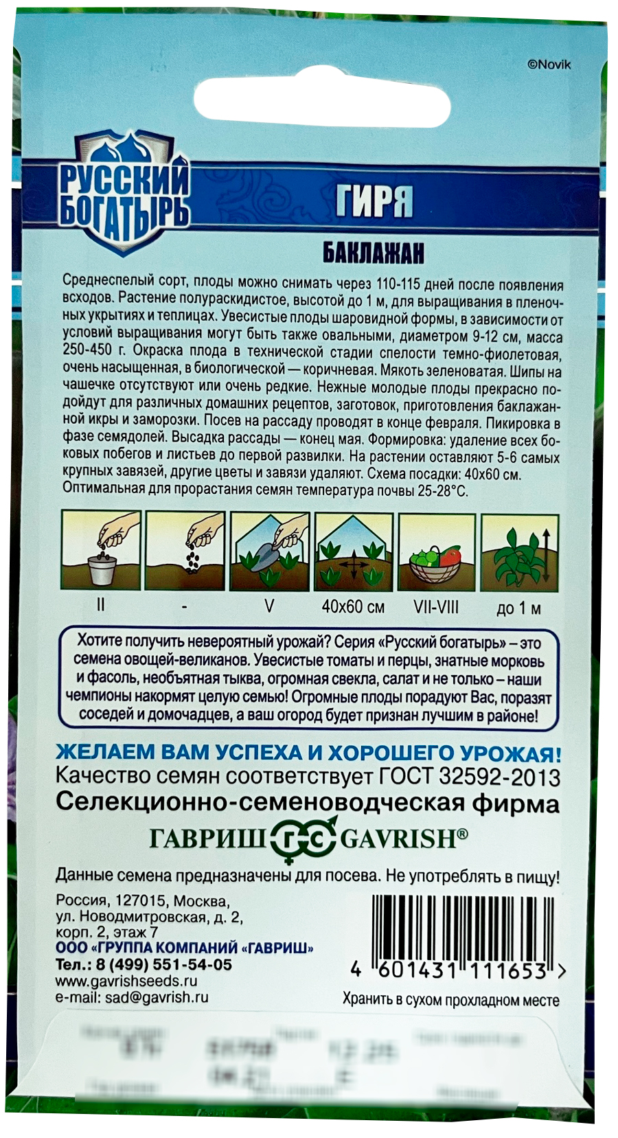 Баклажан Гиря ГАВРИШ серия Русский богатырьСреднеспелый сорт, плоды можно снимать через 110–115 дней после появления всходов. Растение полураскидистое, высотой до 1 м, для выращивания в пленочных укрытиях и теплицах. Увесистые плоды шаровидной формы, в зависимости от условий выращивания могут быть также овальными, диаметром 9–12 см, масса 250–450 г. Окраска плода в технической стадии спелости темно-фиолетовая, в биологической — коричневая. Мякоть зеленоватая. Шипы на чашечке отсутствуют или очень редкие. Нежные молодые плоды прекрасно подойдут для различных домашних рецептов, заготовок, приготовления баклажанной икры и заморозки. Посев на рассаду проводят в конце февраля. Пикировка в фазе семядолей. Высадка рассады — конец мая. Формировка: удаление всех боковых побегов и листьев до первой развилки. На растении оставляют 5–6 самых крупных завязей, другие цветы и завязи удаляют. Схема посадки: 40х60 см.
