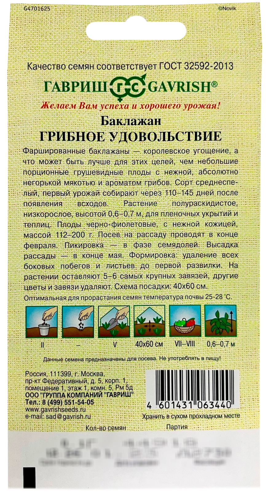 Баклажан Грибное удовольствие ГАВРИШФаршированные баклажаны — королевское угощение, а что может быть лучше для этих целей, чем небольшие порционные грушевидные плоды с нежной, абсолютно не горькой мякотью и ароматом грибов. Сорт среднеспелый, первый урожай убирают через 110-145 дней после появления всходов. Растение полураскидистое, низкорослое, высотой 0,6-0,7 м, для пленочных укрытый и теплиц. Плоды черно-фиолетовые, с нежной кожицей, массой 112-200 г. Посев на рассаду проводят в конце февраля. Пикировка в фазе семядолей. Высадка рассады – конец мая. Формировка: удаление всех боковых побегов и листьев до первой развилки. В южных регионах выращивают в открытом грунте прямым посевом в марте-апреле.