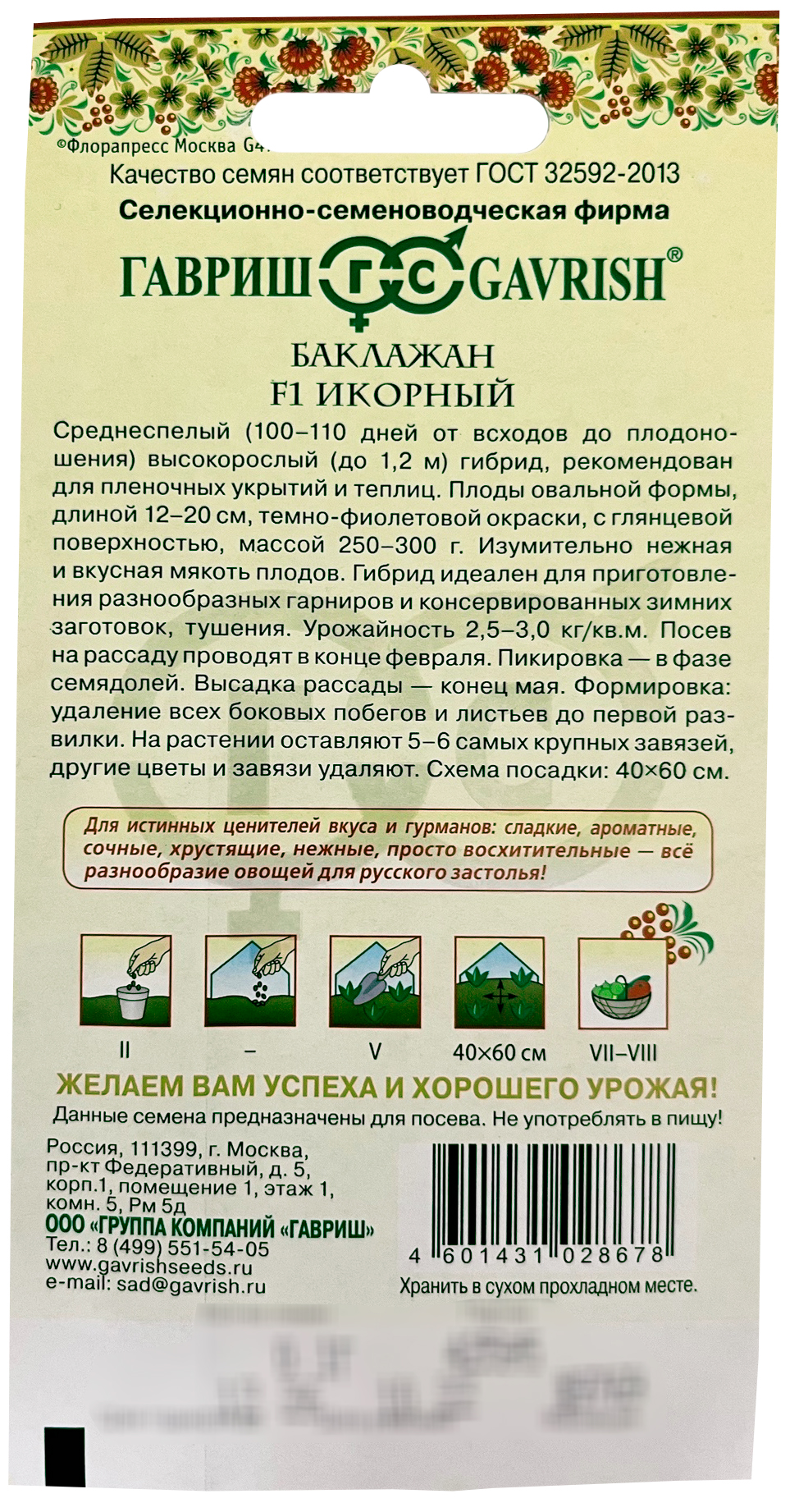 Баклажан ИКОРНЫЙ ГАВРИШСреднеспелый (100-110 дней от всходов до плодоношения) высокорослый (до 1,2 м) гибрид, рекомендован для пленочных укрытий и теплиц. Плоды овальной формы, длиной 12-20 см, темно-фиолетовой окраски, с глянцевой поверхностью, массой 250-300 г. Изумительно нежная и вкусная мякоть плодов. Идеален для приготовления разнообразных гарниров и консервированных зимних заготовок, тушения. Посев на рассаду проводят в конце февраля. Пикировка &ndash, в фазе семядолей. Высадка рассады &ndash, конец мая. Формировка: удаление всех боковых побегов и листьев до первой развилки. К концу июля на растении оставляют 5-6 самых крупных завязей, другие цветы и завязи удаляют. Схема посадки 40 х 60 см. Товарная урожайность 2,5-3,0 кг/м2.
