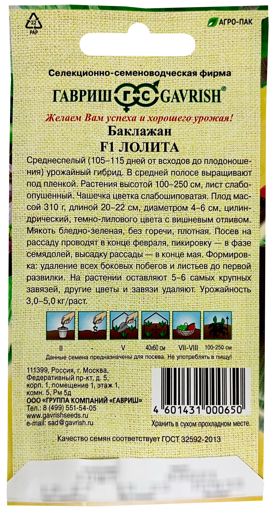 Баклажан Лолита F1 ГАВРИШСреднеспелый (105-115 дней от всходов до плодоношения) среднерослый (70-80 см) гибрид, рекомендован для пленочных теплиц. Посев на рассаду- в конце февраля. Пикировка- в фазе семядолей. В теплицу рассаду высаживают в конце мая. Формировка: удаление всех боковых побегов и листьев до первой развилки. К концу июля оставляют 5-6 самых крупных завязей, другие цветы и завязи удаляют. Плоды цилиндрической формы, длиной 20-22 см, темно-лиловой окраски с вишневым отливом, массой 310 г. Мякоть бледно-зеленая, без горечи, плотная. Схема посадки: 40х 60 см. Урожайность одного растения 1,5-2,0 кг, максимально до 5 кг, в зависимости от условий.