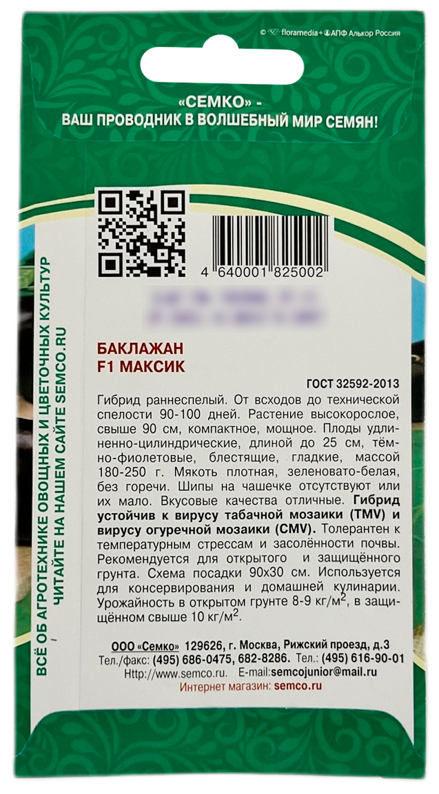 Баклажан Максик СЕМКОГибрид раннеспелый. От всходов до технической спелости 90-100 дней. Растение высокорослое, свыше 90 см, компактное, мощное. Плоды удлиненно-цилиндрической формы, до 25 см, темно-фиолетовой окраски, блестящие, гладкие. Мякоть плотная, зеленовато-белая, без горечи. Вкусовые качества отличные. Используется как в открытом, так и защищенном грунте. Гибрид устойчив к вирусу табачной мозаики и вирусу огуречной мозаики, толерантен к ряду болезней.