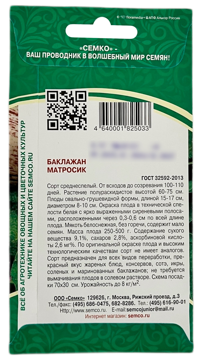 Баклажан МАТРОСИК СЕМКОСорт раннеспелый, высокоурожайный. Растение высокорослое, свыше 90 см, компактное, мощное. Плоды удлинённо-цилиндрической формы, до 25 см, тёмно-фиолетовой окраски, блестящие, гладкие. Мякоть плотная, зеленовато-белая, без горечи. Вкусовые качества отличные. Выращивается как в открытом, так и в защищённом грунте. Гибрид устойчив к вирусу табачной мозаики и вирусу огуречной мозаики, толерантен к ряду болезней.